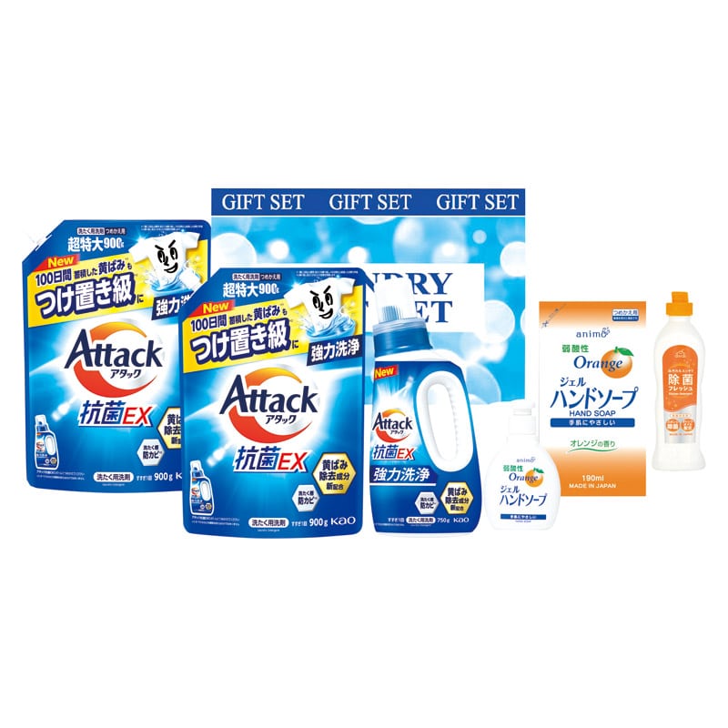 ・内容:アタック抗菌EX超特大(詰替)(900g)×2、アタック抗菌EX(750g)・台所洗剤除菌フレッシュ(240g)・弱酸性ジェルハンドソープ(200ml)・弱酸性ジェルハンドソープ(詰替)(190ml)×各1