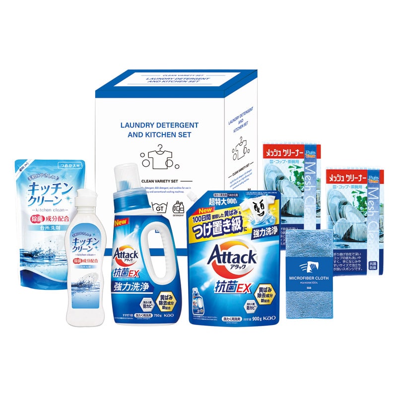 ・内容:メッシュクリーナー(中国)×2、花王アタック抗菌EX本体(750g)・花王アタック抗菌EX詰替用(900g)・キッチンクリーン(250ml)・キッチンクリーン詰替(200ml)・マイクロファイバークロス(中国)(20×20cm)×各1