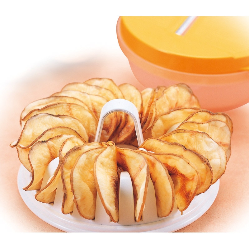 電子レンジで簡単にパリパリのチップスが作れちゃう。ノンフライだからお子様のおやつはもちろん、ダイエットやお酒のおつまみにもぴったり。専用スライサーとホルダー付きで簡単・安全にスライスできます。