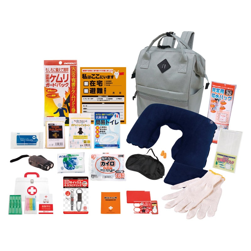・内容:収納リュック(約190×290×360mm)×1、防災の心得・IDホイッスル&カラビナリング・カイロ・レインコート・抗菌消臭簡易トイレ・ダイナモLEDライト・軍手・アルミブランケット・マスク・アイマスク・耳栓・ネックピロー・避難用ヘッドカバー・給水袋(3L)・ソーイングセット・緊急避難カード・除菌アルコールウェットティッシュ・水に流せるペーパー・救急4点セット×各1