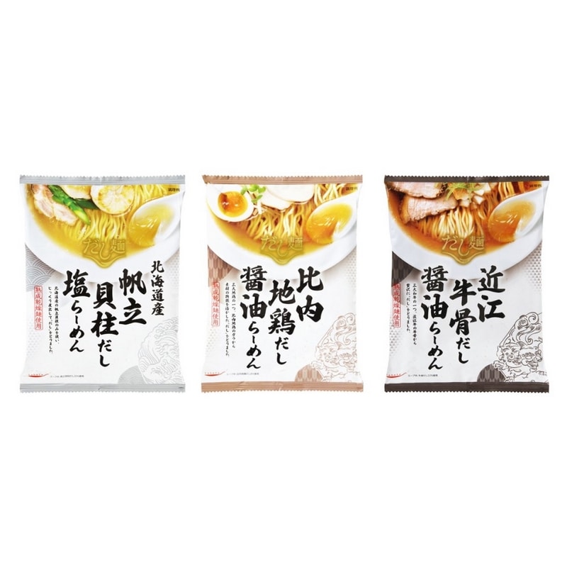 ・内容:北海道産帆立貝柱だし塩らーめん112g・比内地鶏だし醤油らーめん101g・近江牛骨だし醤油らーめん113g×各1