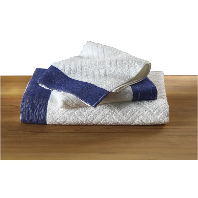 白とネイビーが織りなす、知性溢れるデザイン。 「爽やかさ」と「きちんと感」を兼ね備えた王道の色合わせでフランス語で美しいという意味をもつ「BELLE」という名にふさわしい日本製タオル。エレガントで品のある落ち着いたネイビーの織りデザインでバスルームをお洒落で特別な空間に演出します。