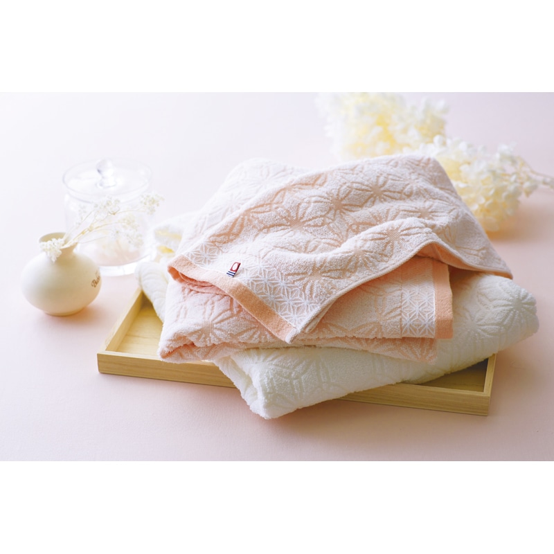 日々のくらしをふわりと包み込んでくれるような、 淡くやさしい色合いの今治タオル。 今治の得意とするジャガード織りで伝統柄を細やかに織り上げ、今治のやわらかい軟水と洗いの技術で綿本来のやわらかさを引き出しています。