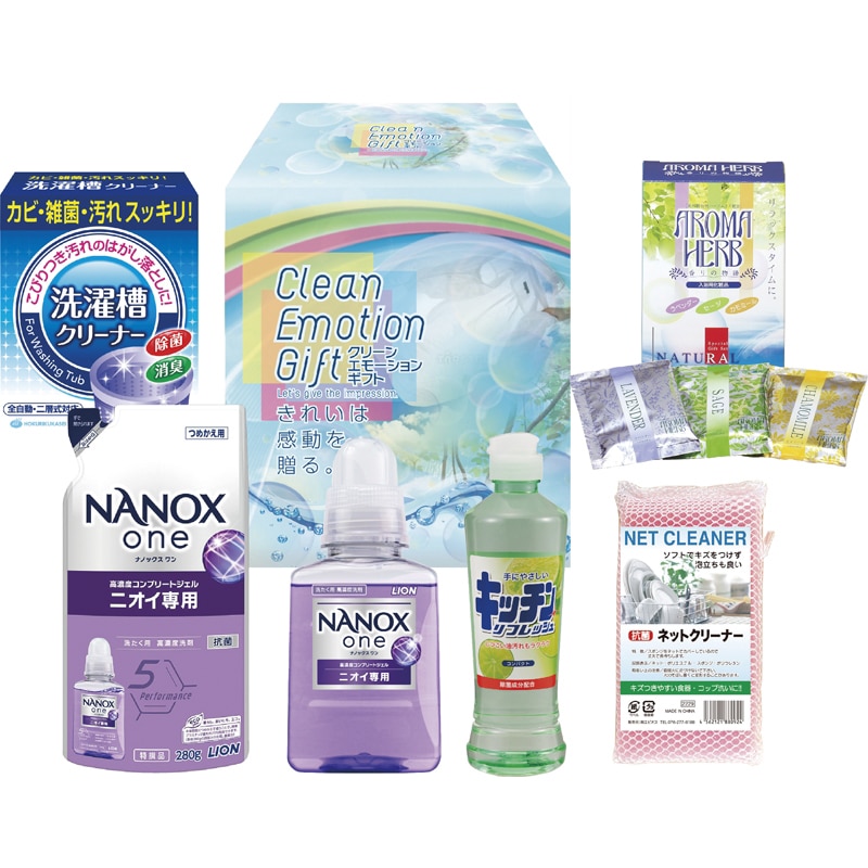 ・内容:ライオンNANOX one380g・ライオンNANOX one 詰替用280g・キッチンリフレッシュコンパクト270ml・洗濯槽クリーナー(50g×2包)・ハーブエキス配合入浴料(30g×3包入)・ネットクリーナー×各1