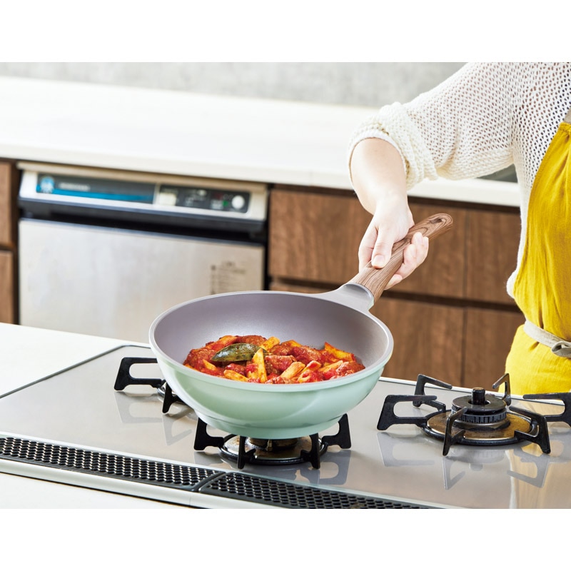 さわやかなくすみグリーンで、キッチンを鮮やかに彩ります。こびりつきにくいダイヤモンドコート加工。接合部分にリベット(留め具)がない為、洗いやすいです。軽量なアルミダイカストを採用。強度に優れ、熱伝導率が高いため、素早く調理できます。PFOA・PFOS不使用。レシピブック付。