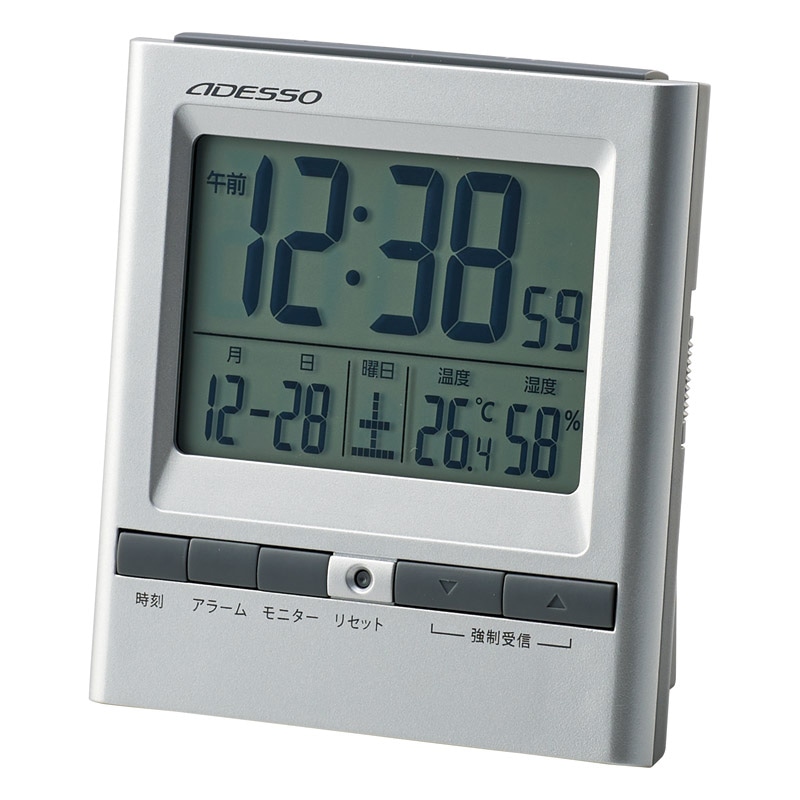 2つの時刻にアラームを設定できる温湿度表示付の電波目覚まし時計。
