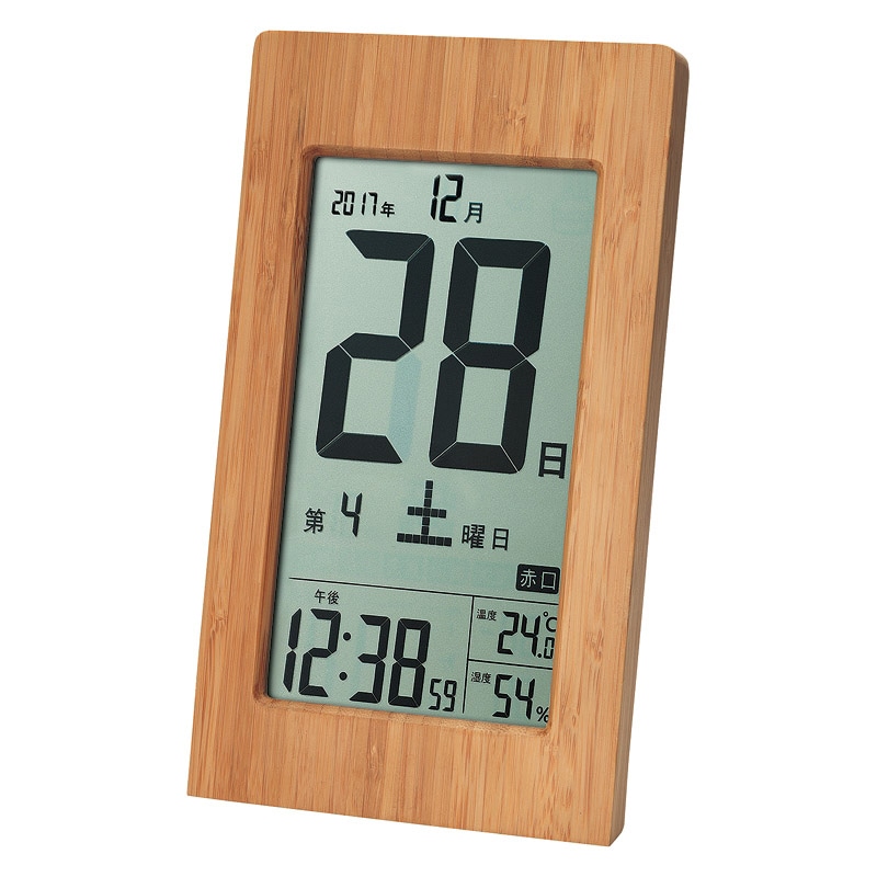 竹のフレームで和室にも合うデジタル日めくり電波時計。