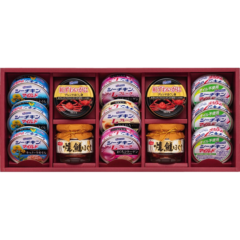 ・内容:シーチキンマイルド(キャノーラオイル・オイル不使用)(各70g)×各3、シーチキンLフレークコラーゲン入り(70g)・紅ずわいがにブレンドほぐし身(55g)・焼鮭ほぐし(50g)×各2、シーチキンLフレークgABA入り(70g)×1