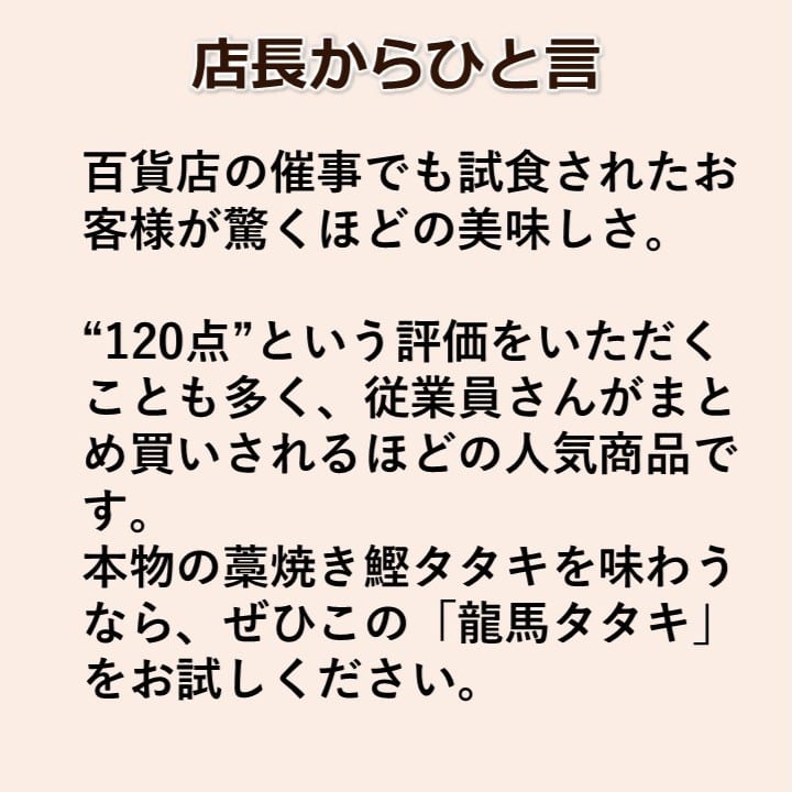 今では、高知県の鰹のタタキといえば、「龍馬タタキ」というくらい有名なタタキとなりました。