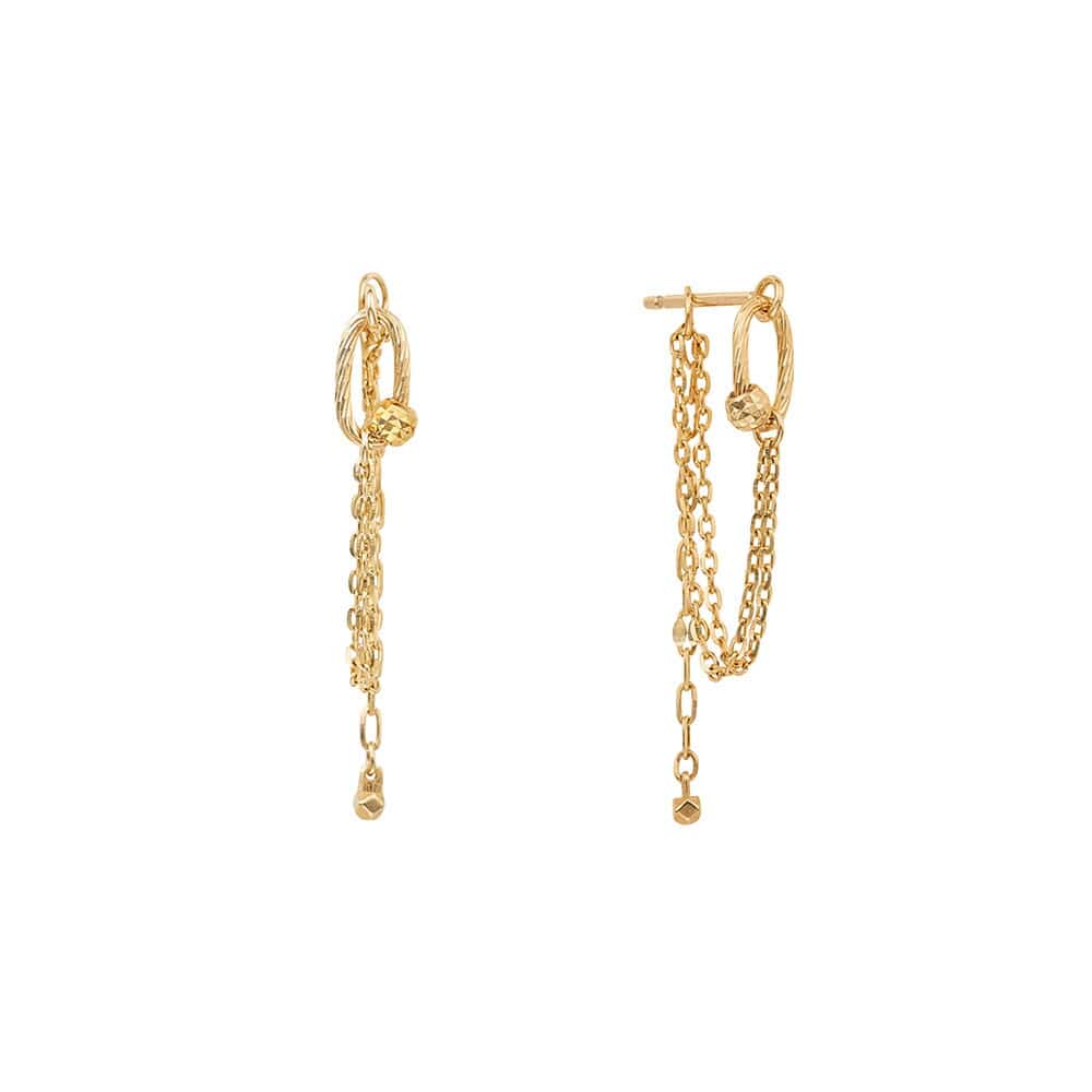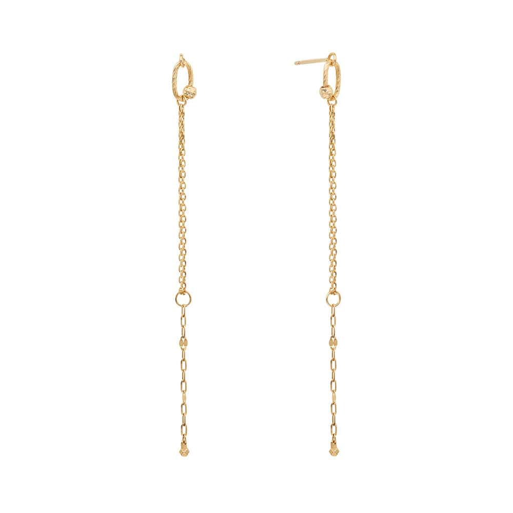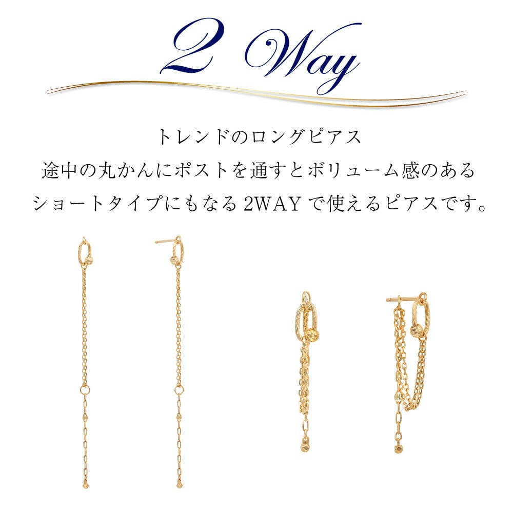 トレンドのロングピアス途中の丸かんにポストを通すとボリューム感のあるショートタイプにもなる2WAYで使えるピアスです。