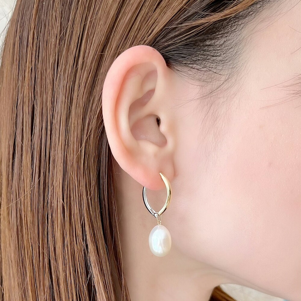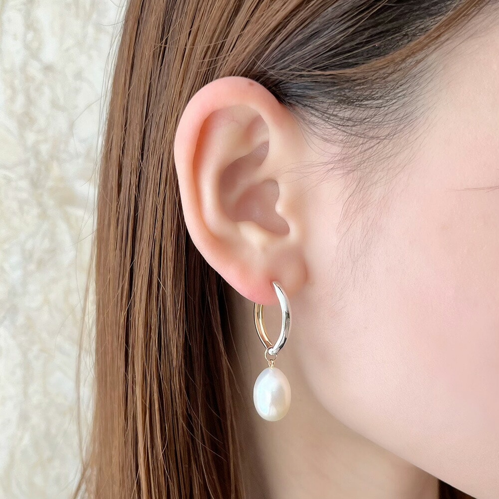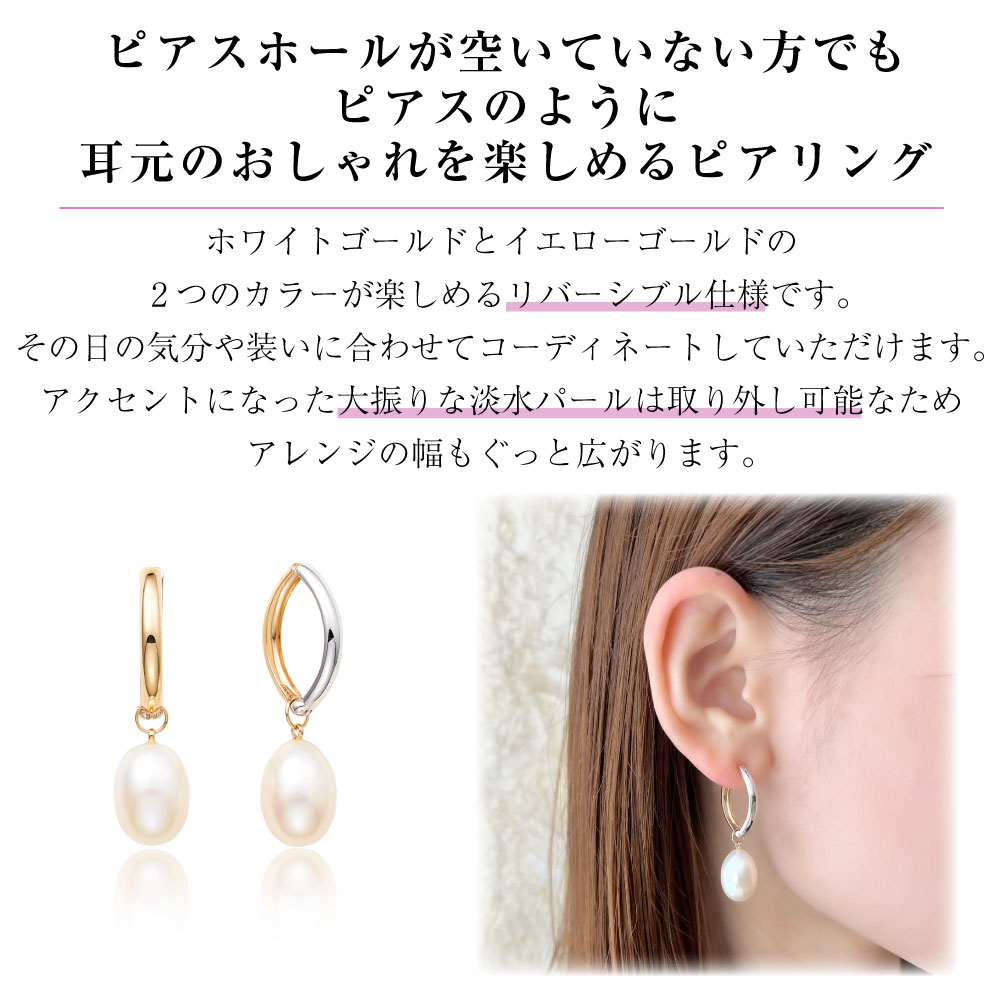 ピアスホールが空いていない方でも、ピアスのように耳元のおしゃれを楽しめるピアリング。ホワイトゴールドとイエローゴールドの2つのカラーが楽しめるリバーシブル仕様です。その日の気分や装いに合わせてコーディネートしていただけます。アクセントになった大振りな淡水パールは取り外し可能なため、アレンジの幅もぐっと広がります。