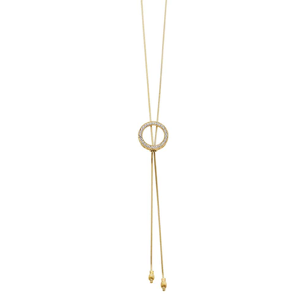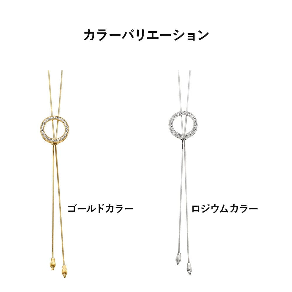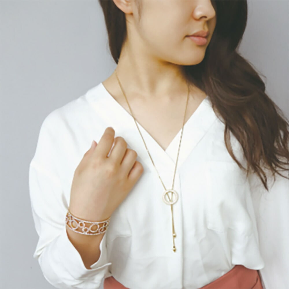 毎日のスタイルに合わせるアクセサリーに悩んだら、これで決まり!一つは持っておきたい、ラリエットのネックレス。シンプルなデザインだから、どんなアイテムとも相性がよく、着けるだけでスタイルが華やぎます。縦のラインがスタイルをシャープに見せてくれるので、着やせ効果も。リング部分で長さを調節できるので、自在に表情に変えることが出来ます。