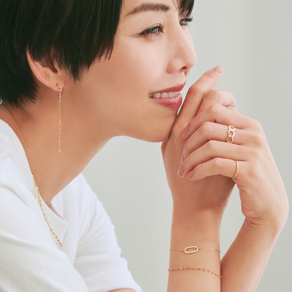 表面に流水をイメージした柄を施した楕円のパーツがワンポイントのブレスレットお揃いのネックレスとコーディネートして着けるのもおすすめです。シンプルなブレスレットとの重ね着けのアクセントにもなります。