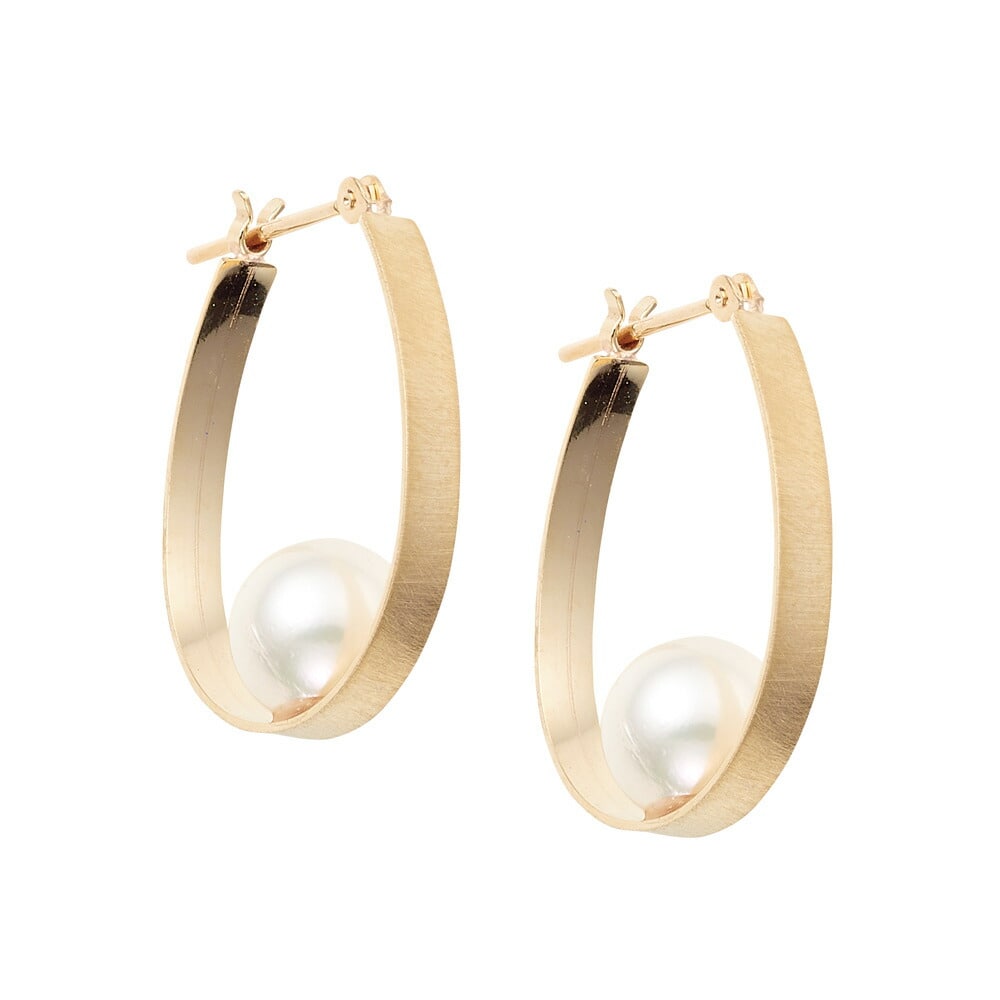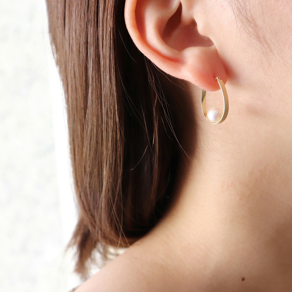 マットに仕上げた地金のオーバルフープの内側にアコヤパールをのせたボリューム感のあるピアス。正面からちょこっと覗くパールのテリでコントラストを表現しました。着けるだけで、コーディネートのアクセントになるアイテムです。
