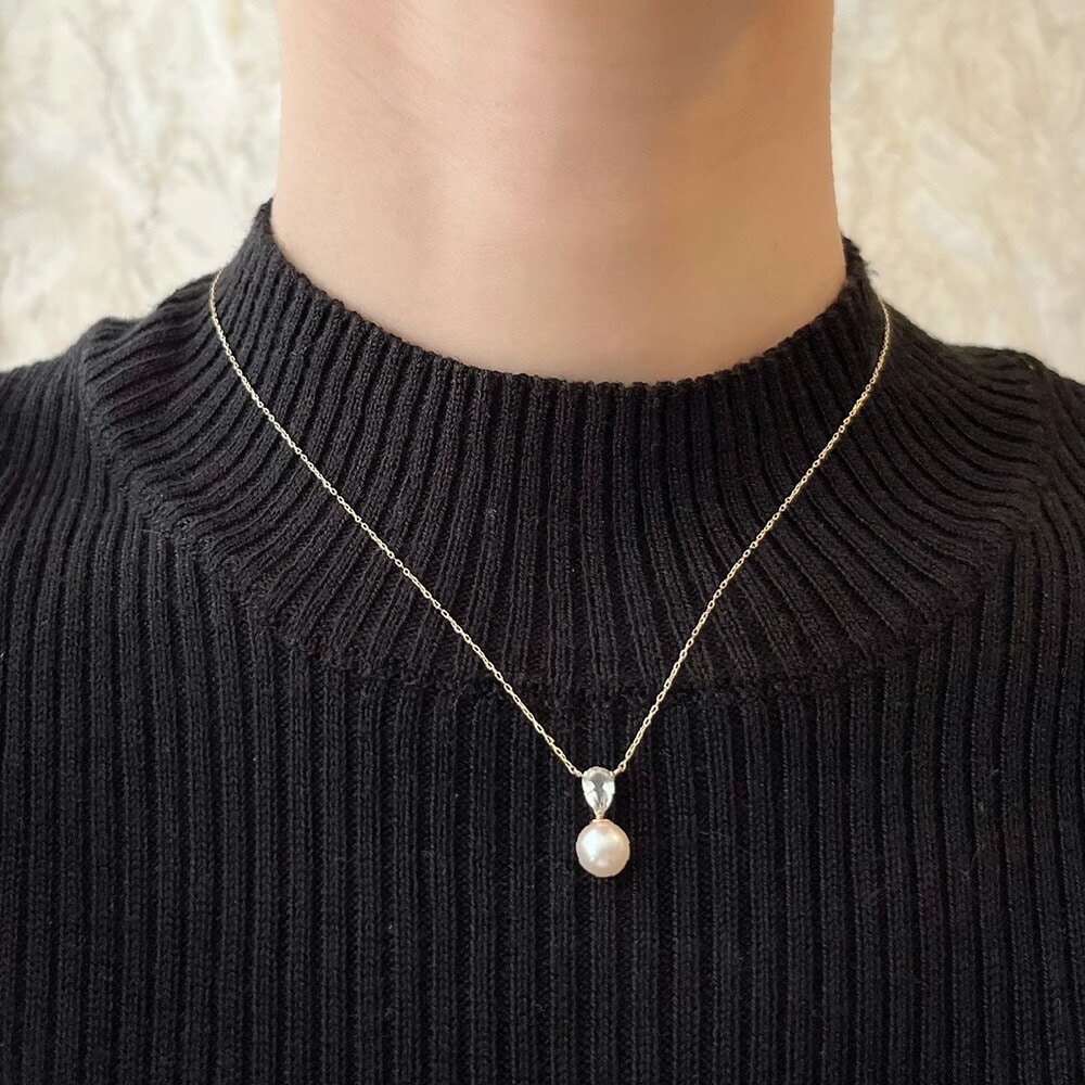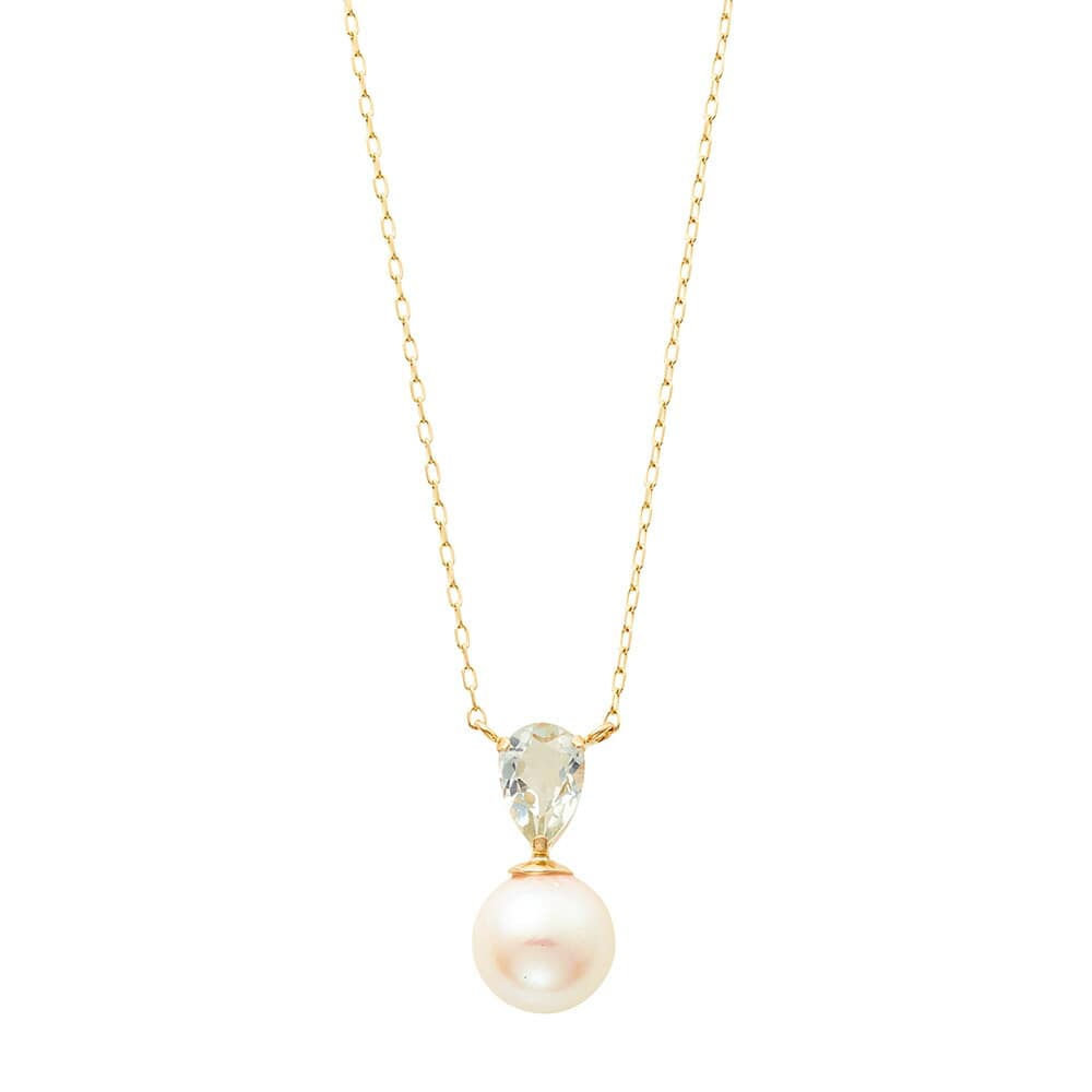 みずみずしく輝くグリーンアメジストと柔らかで上品なテリが魅力のアコヤパール、二つの異なる輝きを組み合わせたネックレスグリーンアメジストにはペアシェイプカットを施し、デコルテをすっきりとみせてくれるデザインです。着けるだけで、可憐で清楚な印象に仕上げてくれます。