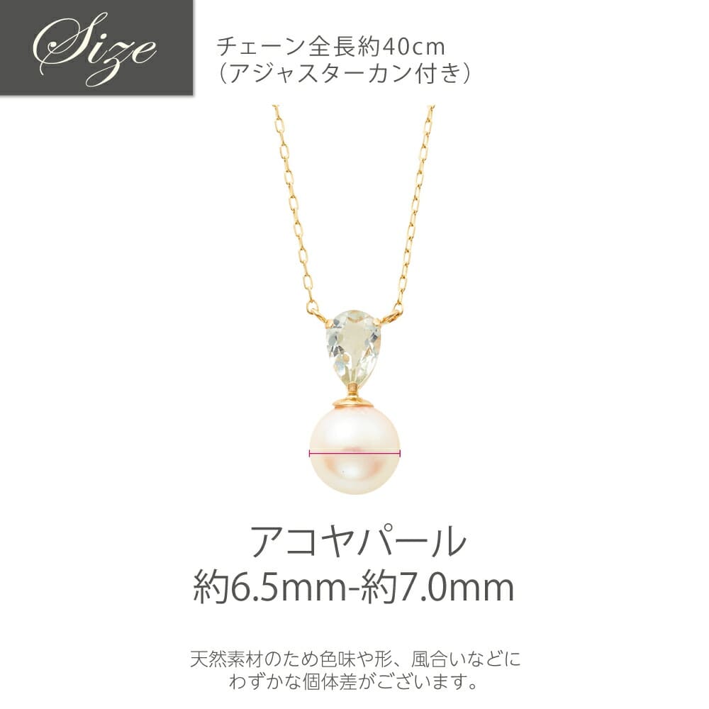 材質等:K10YG使用石:アコヤパールグリーンアメジスト石目:アコヤパール:6.5mm-7.0mmサイズ:チェーン全長約40cm(アジャスターカン付き)品番:130508070046備考:天然石・パールには、石の色味や風合いに個体差がございます。予めご了承下さい。▼サイズガイドはこちらhttps://anamall.ana.co.jp/shop/pages/size-guide.aspx