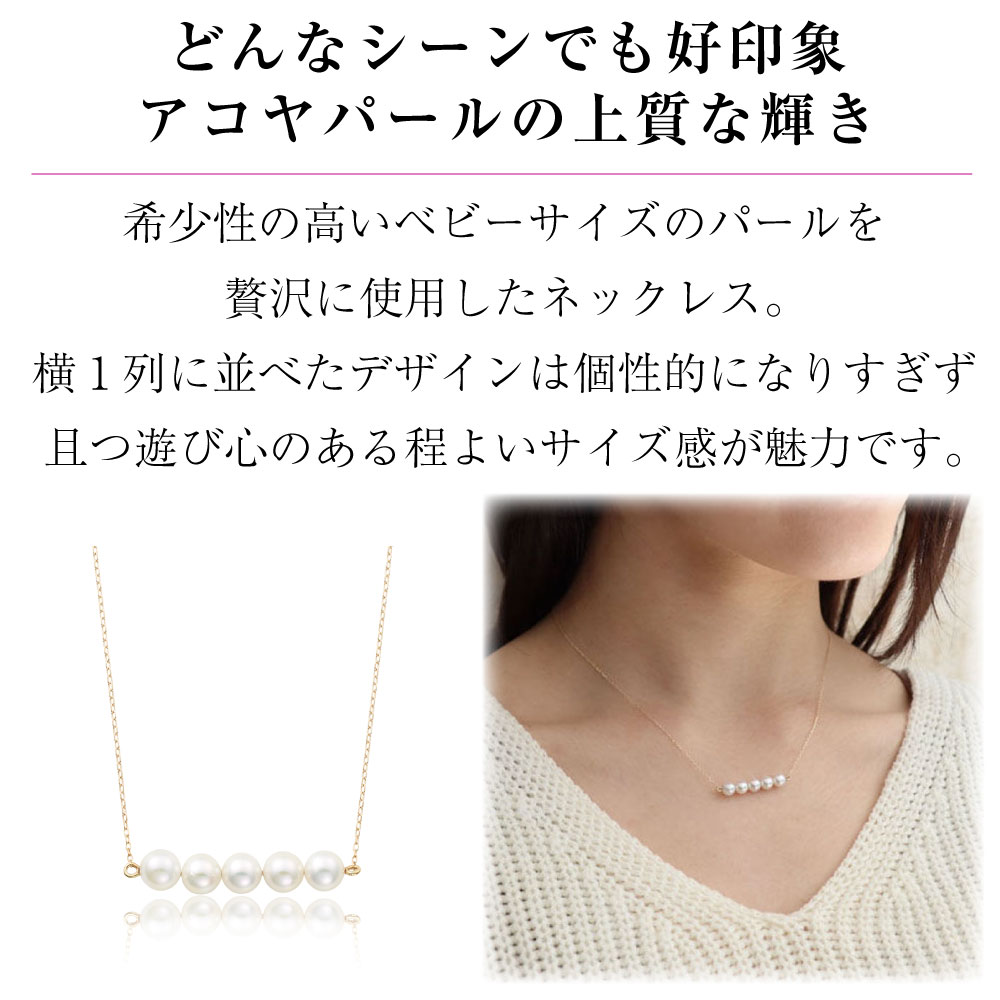 希少性の高いベビーサイズのパールを贅沢に使用したネックレス。横1列に並べたデザインは、個性的になりすぎず、且つ遊び心のある、程よいサイズ感が魅力です。