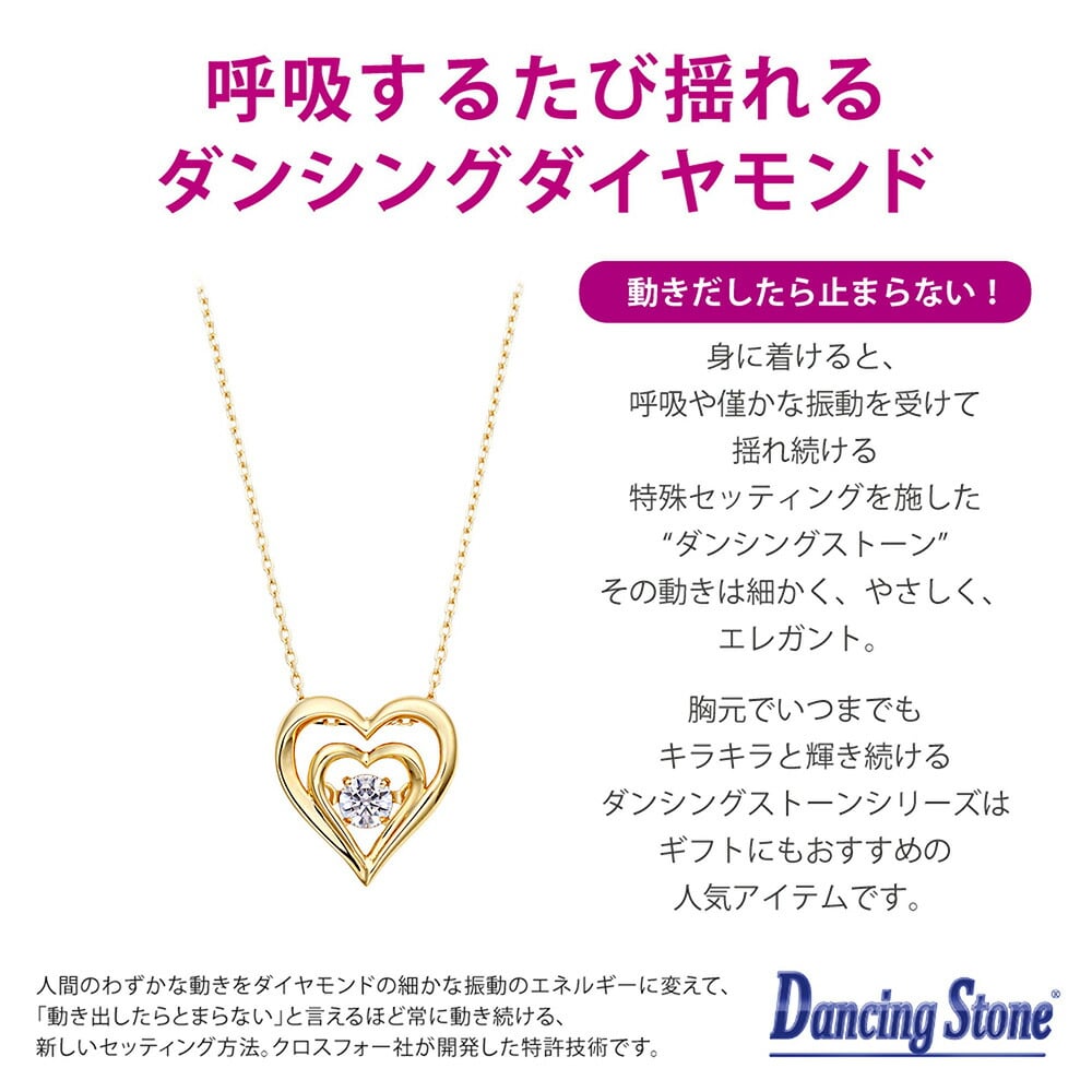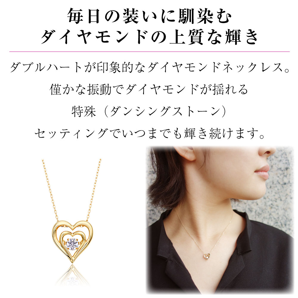 ダブルハートが印象的なダイヤモンドネックレス。 僅かな振動で、ダイヤモンドが揺れる特殊(ダンシングストーン)セッティングで、いつまでも輝き続けます。ダイヤモンドは、理想的なプロポーションを追求し究極のカットが施された、最も美しく輝くハート&キューピッドカットのダイヤモンドが使用されております。