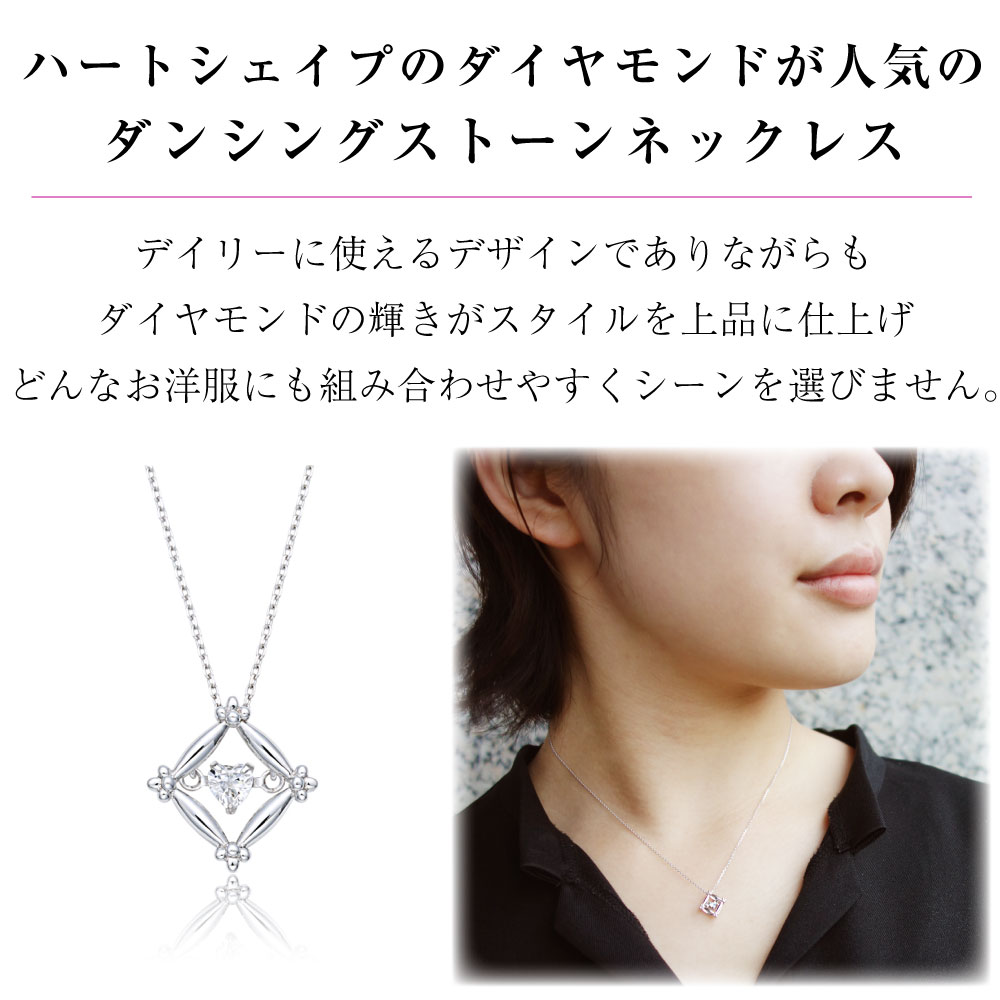 ハートシェイプのダイヤモンドが呼吸をするたびにきらきらと美しく揺れる、人気のダンシングストーンネックレス。デイリーに使えるデザインでありながらも、ダイヤモンドの輝きがスタイルを上品に仕上げ、どんなお洋服にも組み合わせやすく、シーンを選びません。ラウンドのダイヤモンドが多いなか、ハート型に研磨されたダイヤモンドは大切な方へのギフトや頑張った自分へのご褒美にぴったりの特別なダイヤモンドネックレスです。引き輪の爪がハートの形になっているので、着けやすく、かわいさも魅力のひとつ。