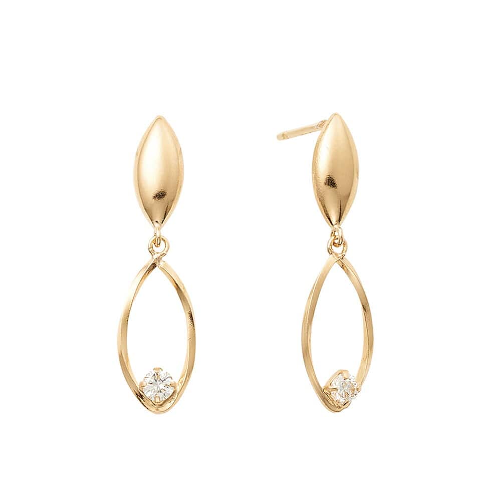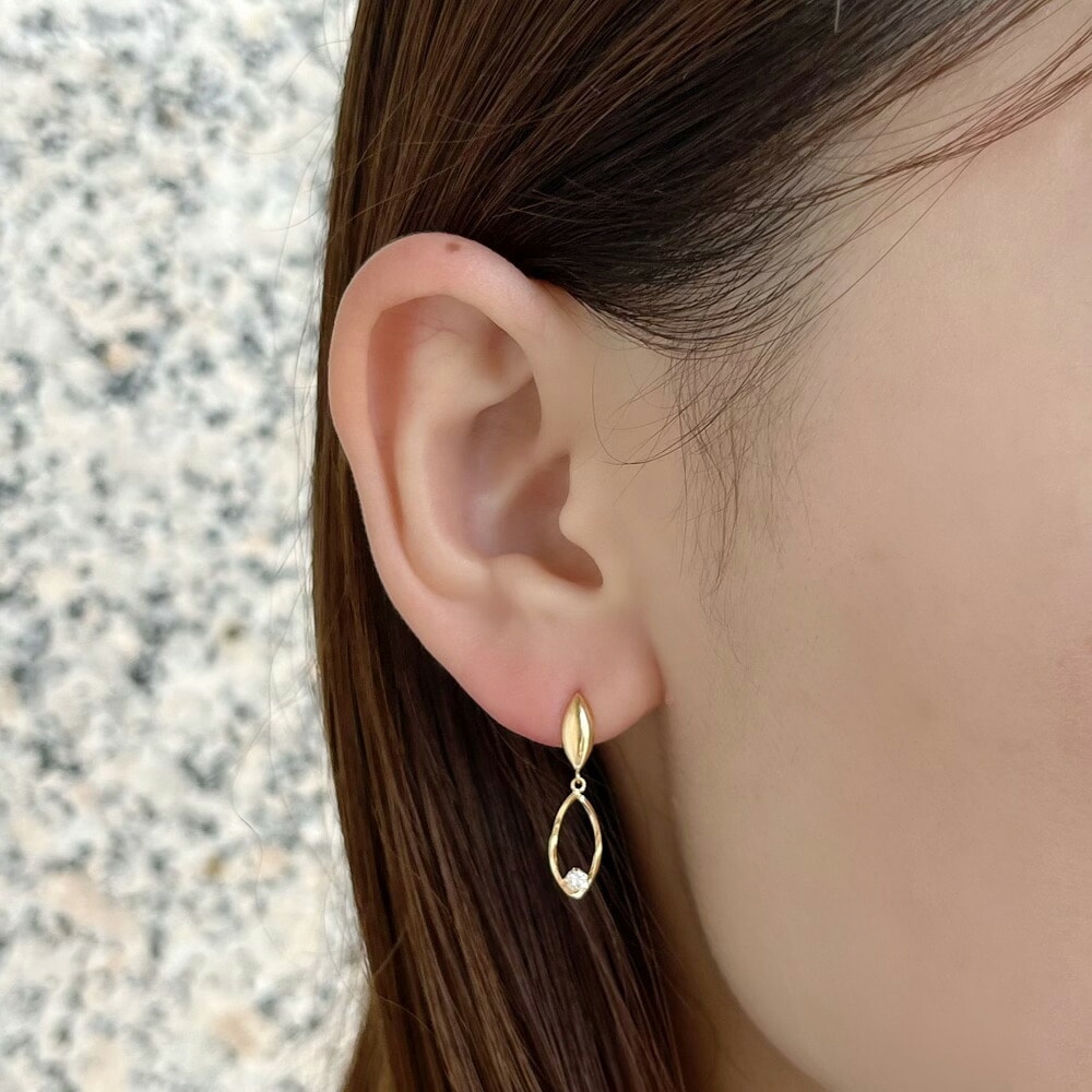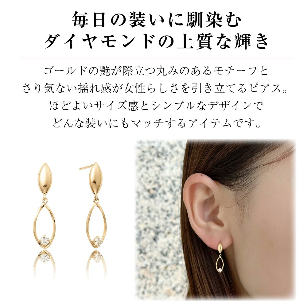 ゴールドの艶が際立つ丸みのあるモチーフと、さり気ない揺れ感が女性らしさを引き立てるピアス。 ほどよいサイズ感とシンプルなデザインで、どんな装いにもマッチするアイテムです。