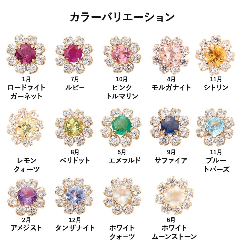 色彩豊かなカラーストーンにきらめくキュービックジルコニアを取り巻いたピアス。着ける人を選ばないシンプルなデザインとお顔周りを上品且つ華やかにみせる絶妙なサイズ感は、普段使いにもぴったり。カラーストーンを初めて着けるという方にもおすすめです。誕生石を使用した豊富なバリエーションで、大切な方へのギフトにも人気の高いアイテムです。