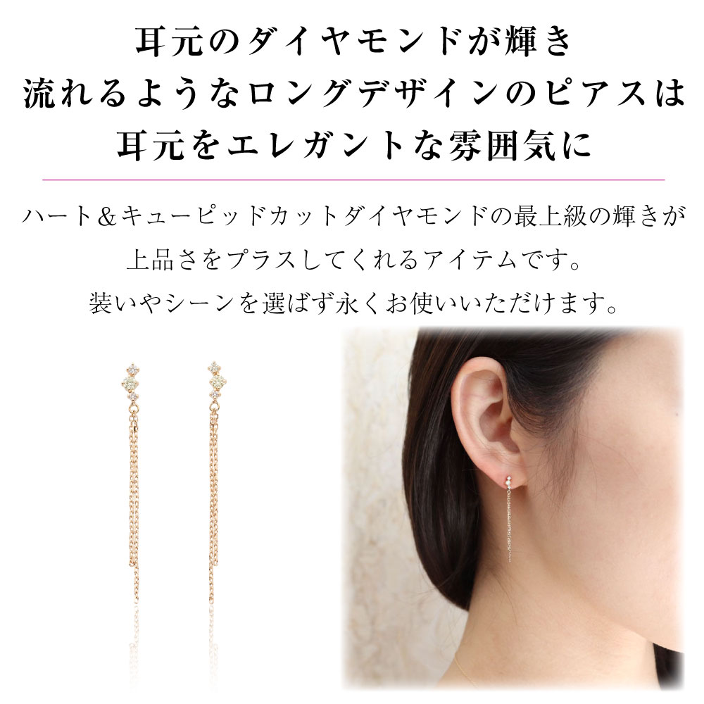 技術の高い職人が精巧に研磨したハート&キューピッドカットダイヤモンドが輝くピアス。付属のスコープでのぞくと、ハート&キューピッドカットダイヤモンドにしか現れない八本の矢が見え、その美しい模様に感動を体験していただけます。耳元のダイヤモンドが輝き、流れるようなロングデザインのピアスは耳元をエレガントな雰囲気にしてくれるアイテムです。ハート&キューピッドカットダイヤモンドの最上級の輝きが上品さをプラスしてくれるアイテムです。装いやシーンを選ばず永くお使いいただけます。