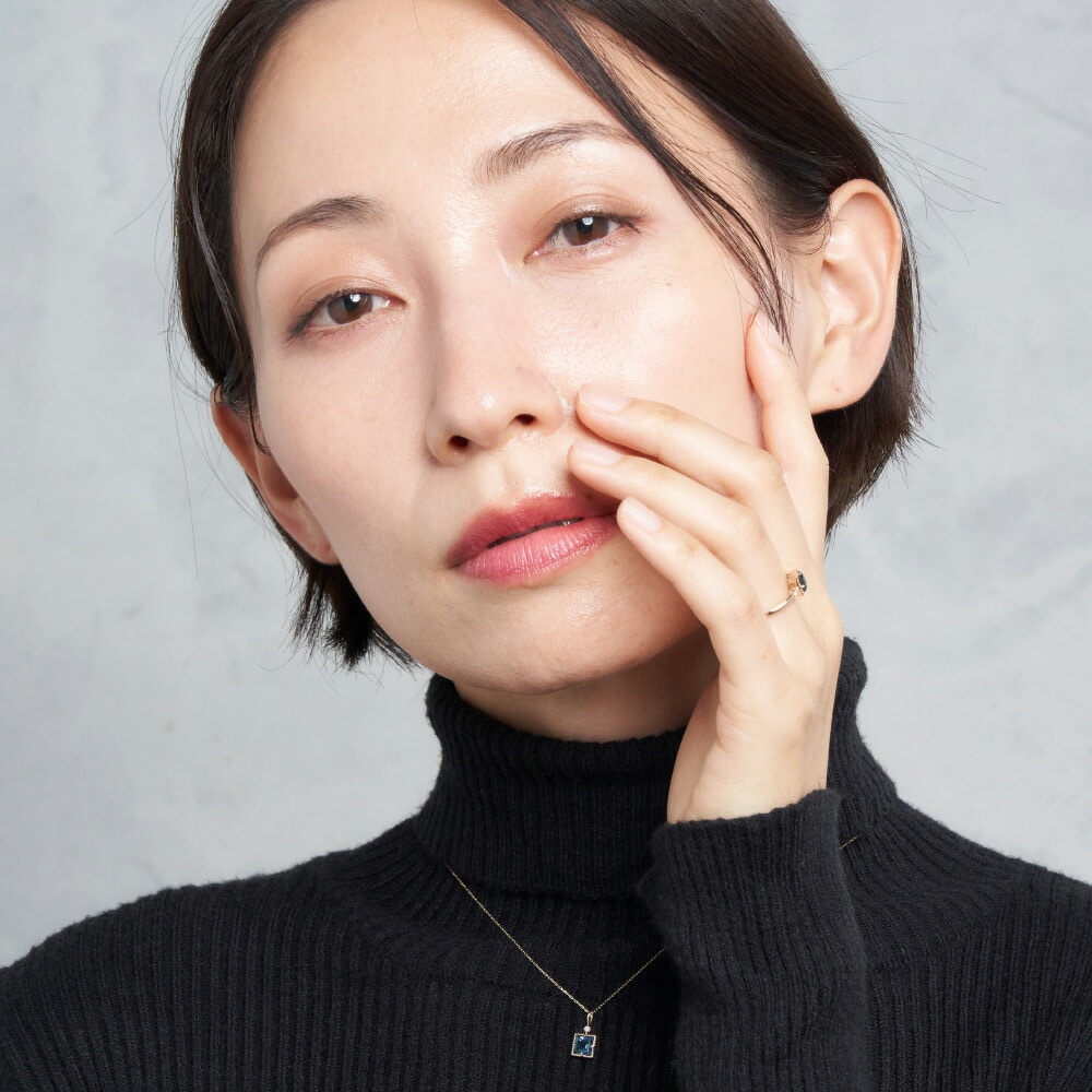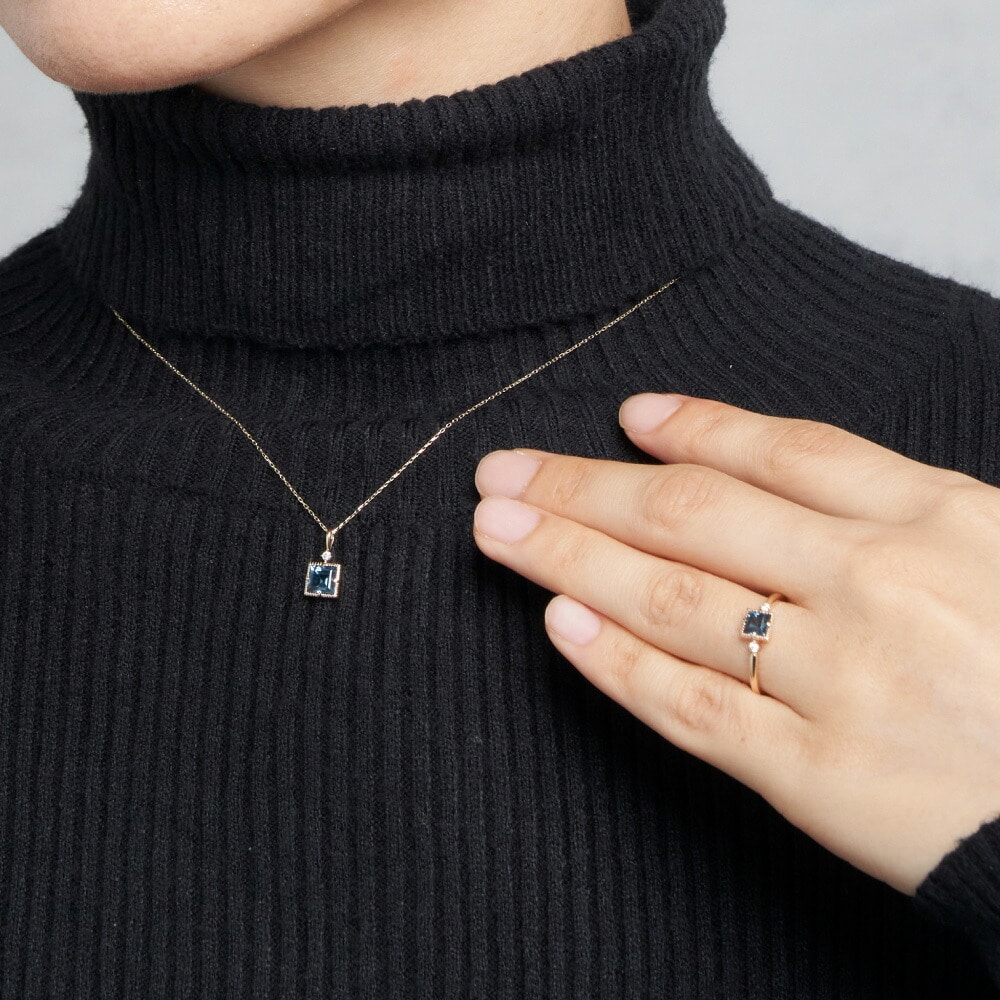 ロンドンブルートパーズの深みのあるブルーが胸元を美しく彩ります。周りの枠が、更なる高級感を演出しています。