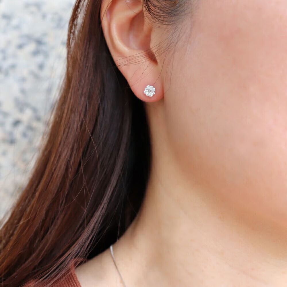 さりげなく上品な輝きをはなつジュエリー。シンプルな中に飾り爪やサイズの違うメレダイヤモンドを使ってスタッドピアスとはまた違う輝きをプラス。お揃いのリング・ネックレスとともにお使いいただくのもおすすめです。