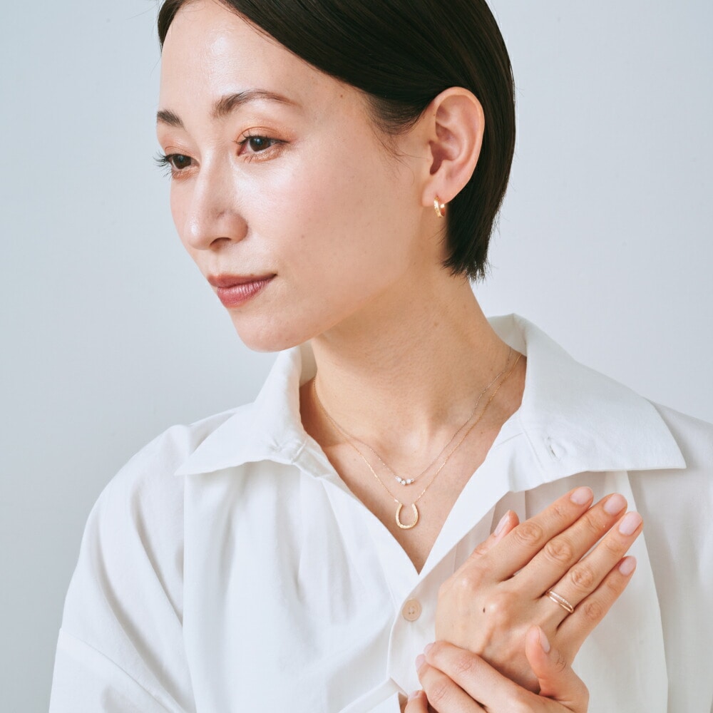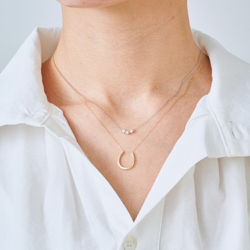 繊細で美しいカッティングが施された馬蹄ネックレス。シンプルながらも、カッティング部分が動くたびにキラキラと輝きを放ちます。馬蹄モチーフは、幸運を呼び寄せこぼれないように守るラッキーシンボルアイテムとしても人気です。