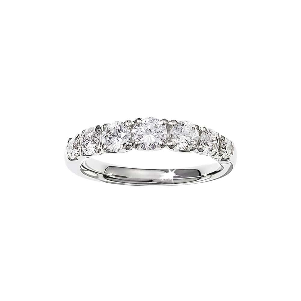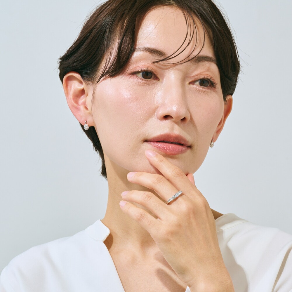 Dカラー:ダイヤモンドの中でもトップグレードの究極の輝きTotal1.0ctのボリュームハーフエタニティー:滑らかなグラデ―ションに並んだ7石でTotal1.0ctのDカラーダイヤモンドは、華やかさを楽しめるのに加え、普段使いしやすいのが魅力です。例えば、手のひら側の半周は地金で着け心地が良く、物を持つ際などもダイヤモンドが引っ掛かりにくいです。 シーンを選ばず身にお着け頂けるベーシックなデザインは、1つは持っておきたいマストアイテムです。