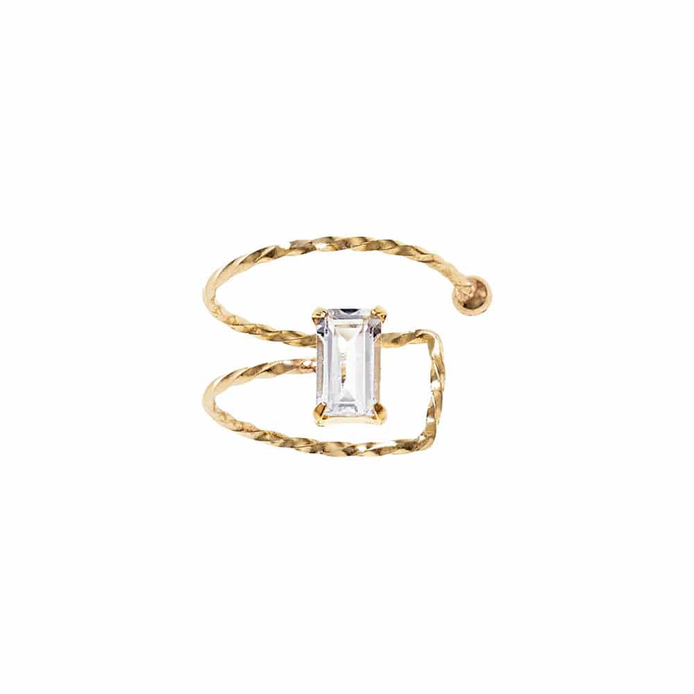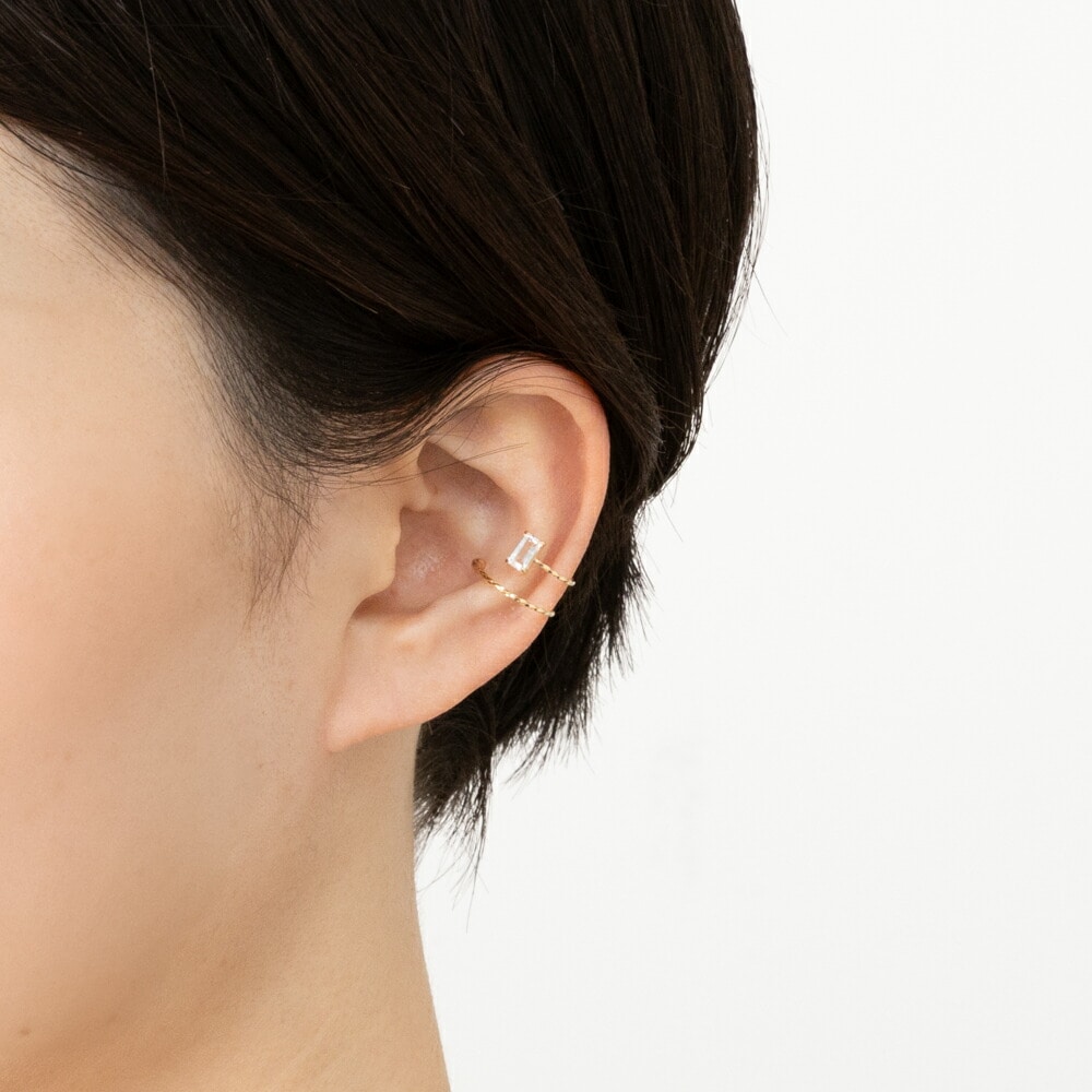 イヤーカフを2つ着けているようなボリューム感が魅力的なイヤーカフです。ツイストした地金とホワイトトパーズの輝きでより華やかに耳元を彩ります。