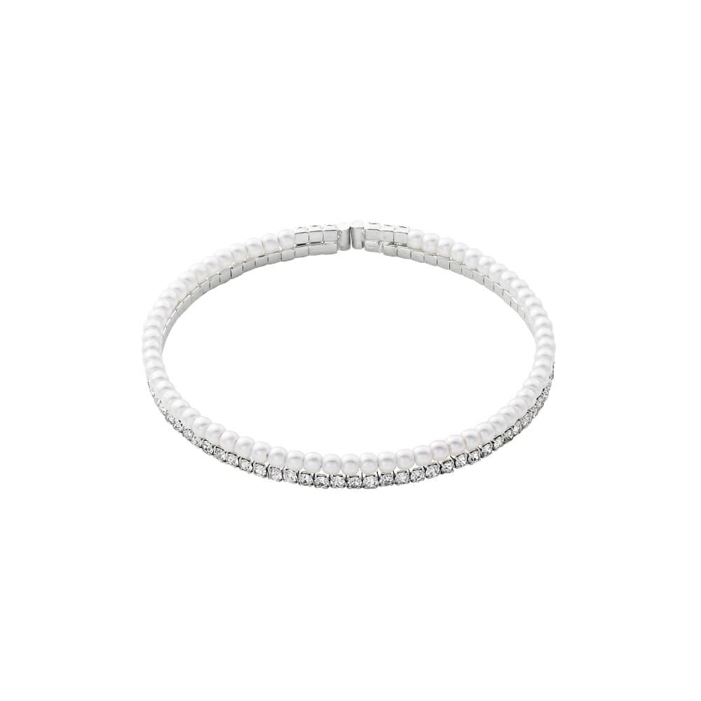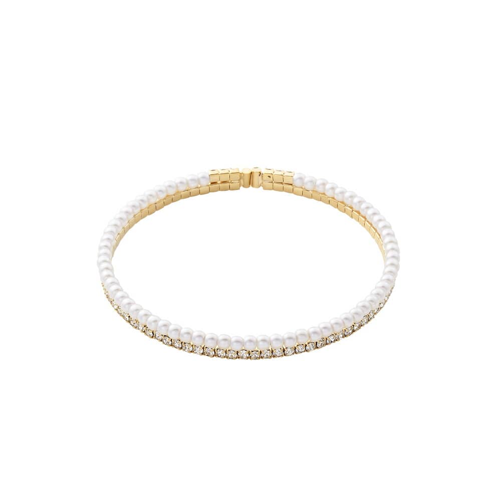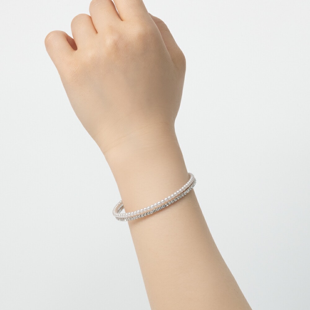 ◆Acce Garden◆クリアストーンとパールのラインがエレガントなバングルです。身に着けるのも簡単で、カジュアルにもフォーマルにもあわせやすい2連はシルバーカラーで上品に、ゴールドカラーでさらに華やかに。