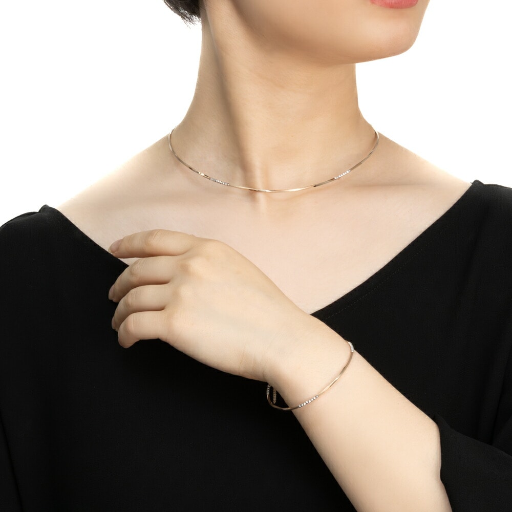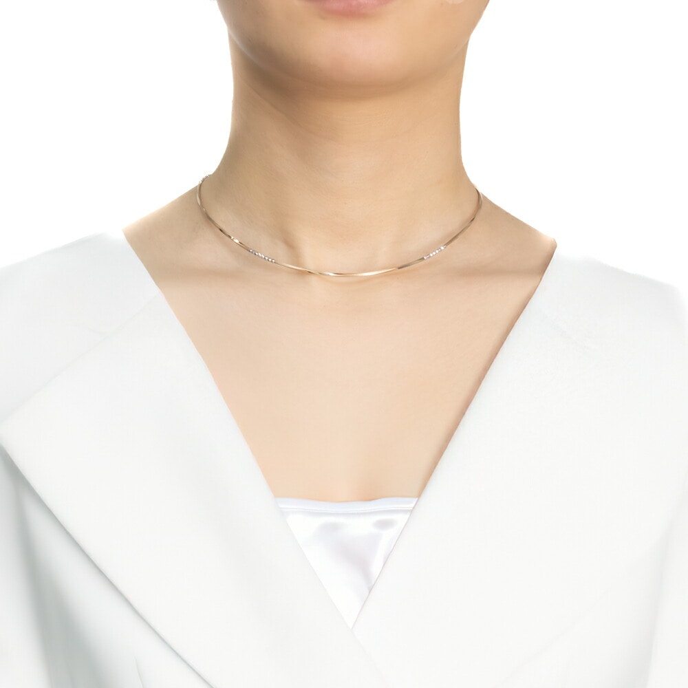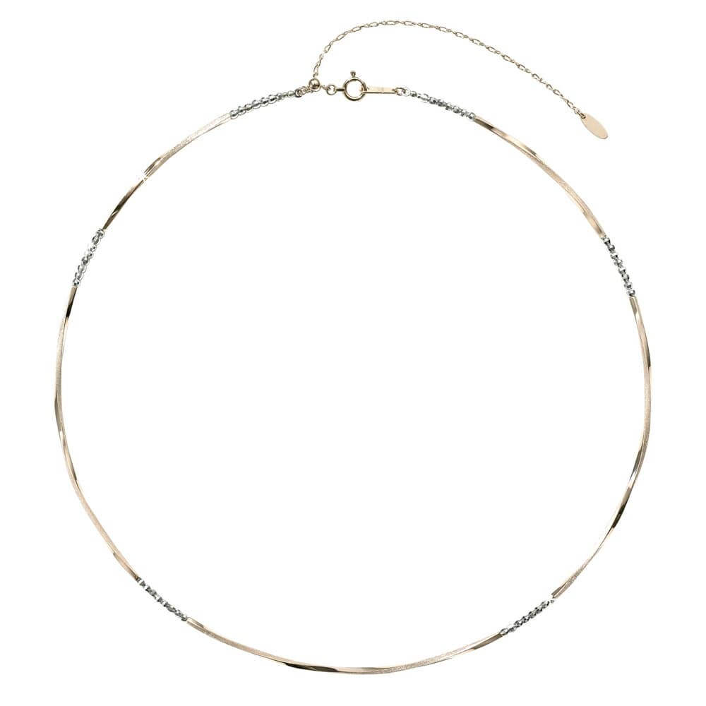 【EARTH GOLD】(アースゴールド)ベリテオリジナルカラー大地から恵みを受けた力強く美しいカラーのゴールド洗練された輝きを放つ特別なゴールドは上品で気品に満ちた色合いで大人の女性を優しく包み込んでくれます。深みのあるアースゴールドは今までのイエローゴールドやピングゴールドとは一味違い、落ち着きがあり着ける方に安心感を与えてくれます。交互につやとつや消しの加工を施した角線に優しくヒネリとカーブを加えたオメガタイプのネックレスです。間でPTのカットボールがキラキラと輝きます。