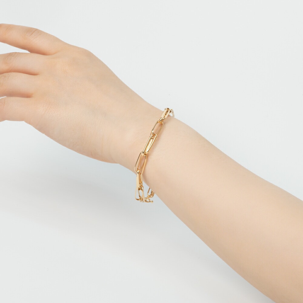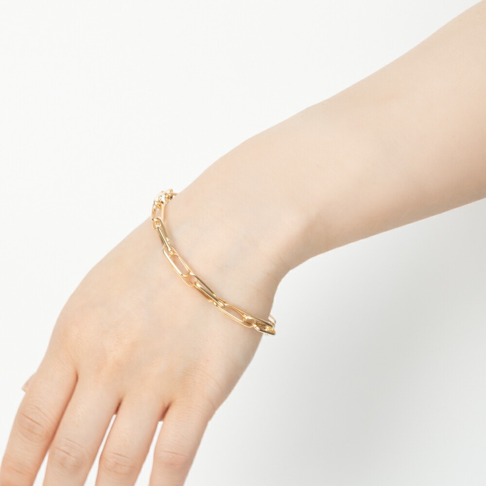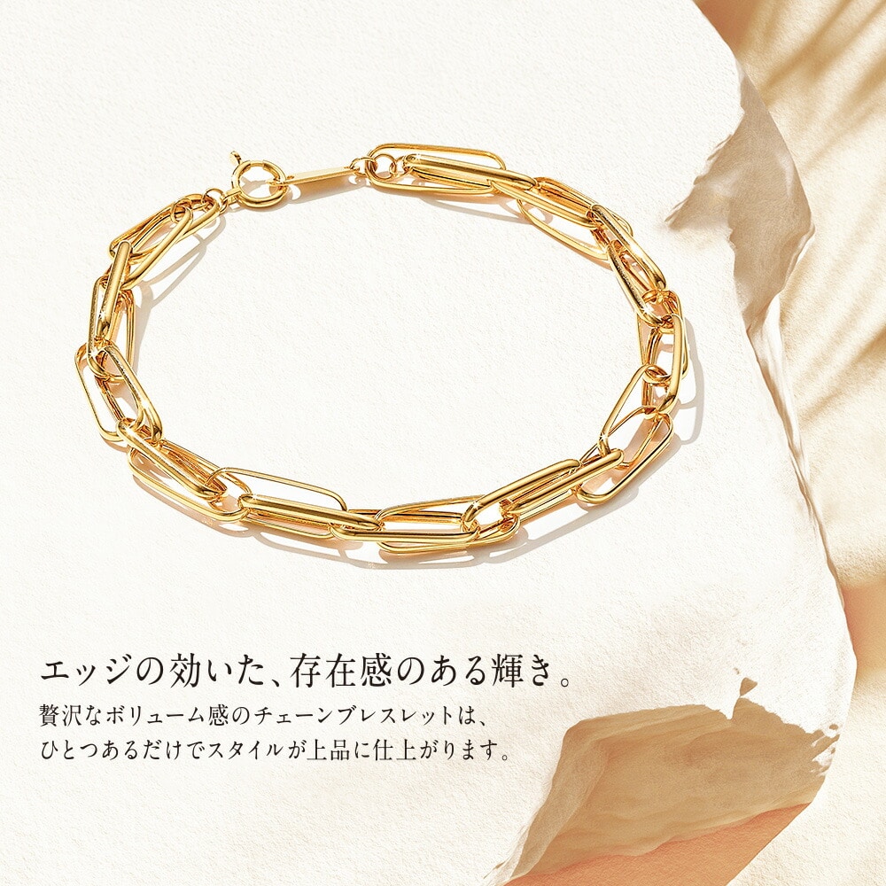 人気のK18YGボリュームブレスレット色合いの美しさや耐久性、肌への馴染みやすさなどから人気があるK18YGで、エッジの効いたボリュームのあるデザインですが、中空チェーンなので見ためのボリュームよりも軽やかな着け心地の新作ブレスレットです。