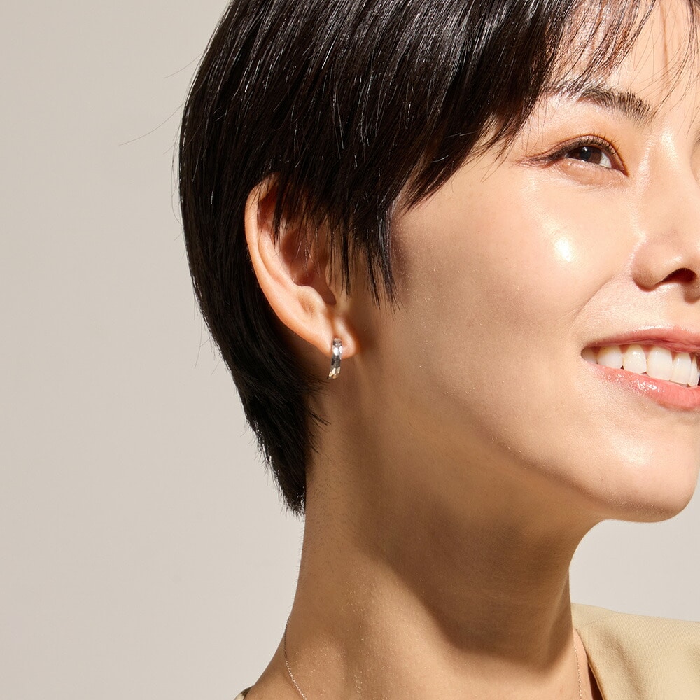 様々な方向からの光によって輝きのニュアンスが変わる上品なデザインのピアス。使い勝手の良い輝きを楽しめるピアス。