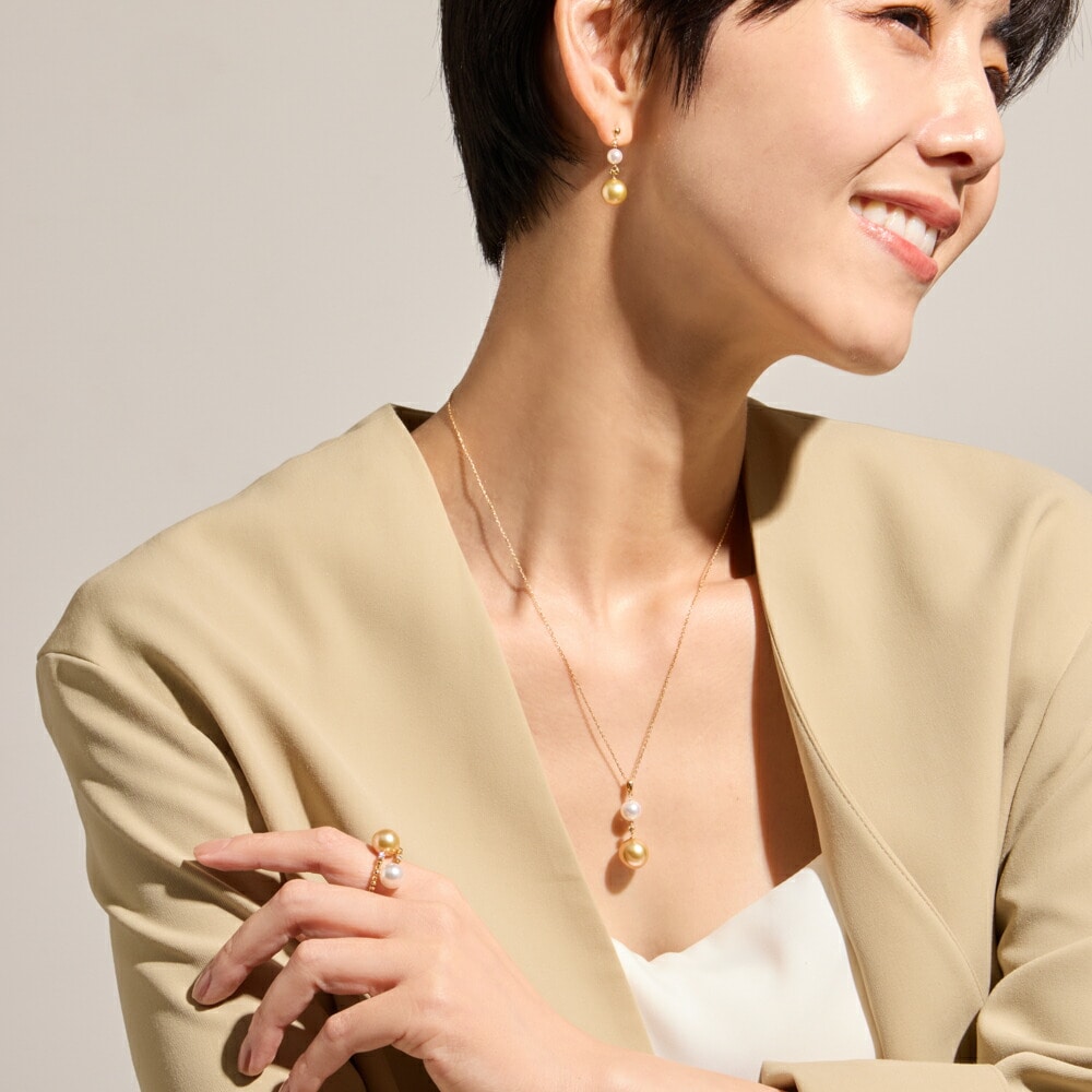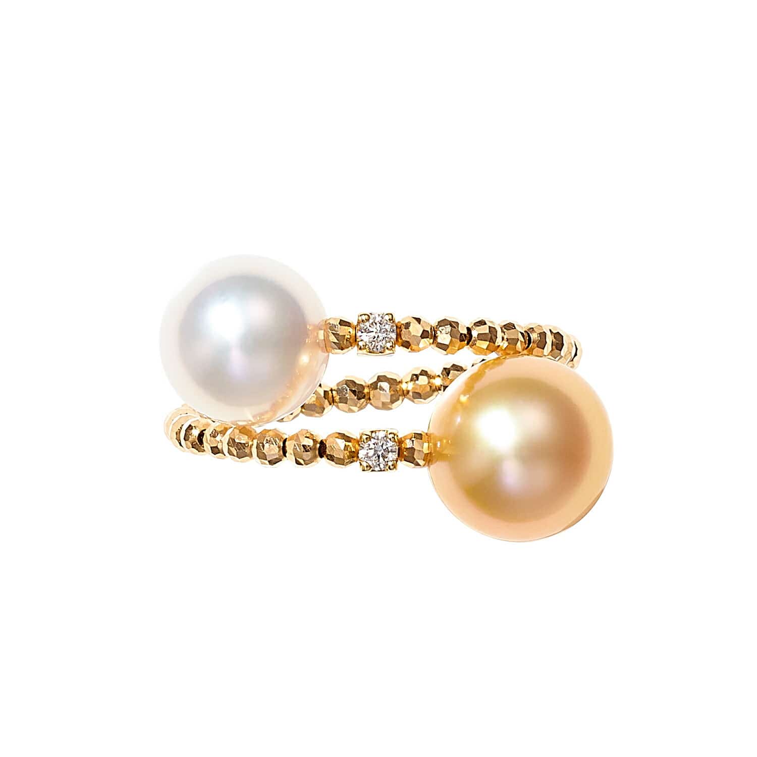 ◆デザイン:奄美大島産の白蝶ゴールドパールと国産のアコヤパールを組み合わせることで、ゴールドとホワイトのコントラストが際立ち、華やかで明るい雰囲気を醸し出しつつ、上品さも兼ね備えたジュエリーです。人気のゴールドでボリュームたっぷりのリングを着けやすいデザインに仕上げました。リングにはキラリと輝くダイヤモンドもあしらい、さらに華やかさをプラスしました。