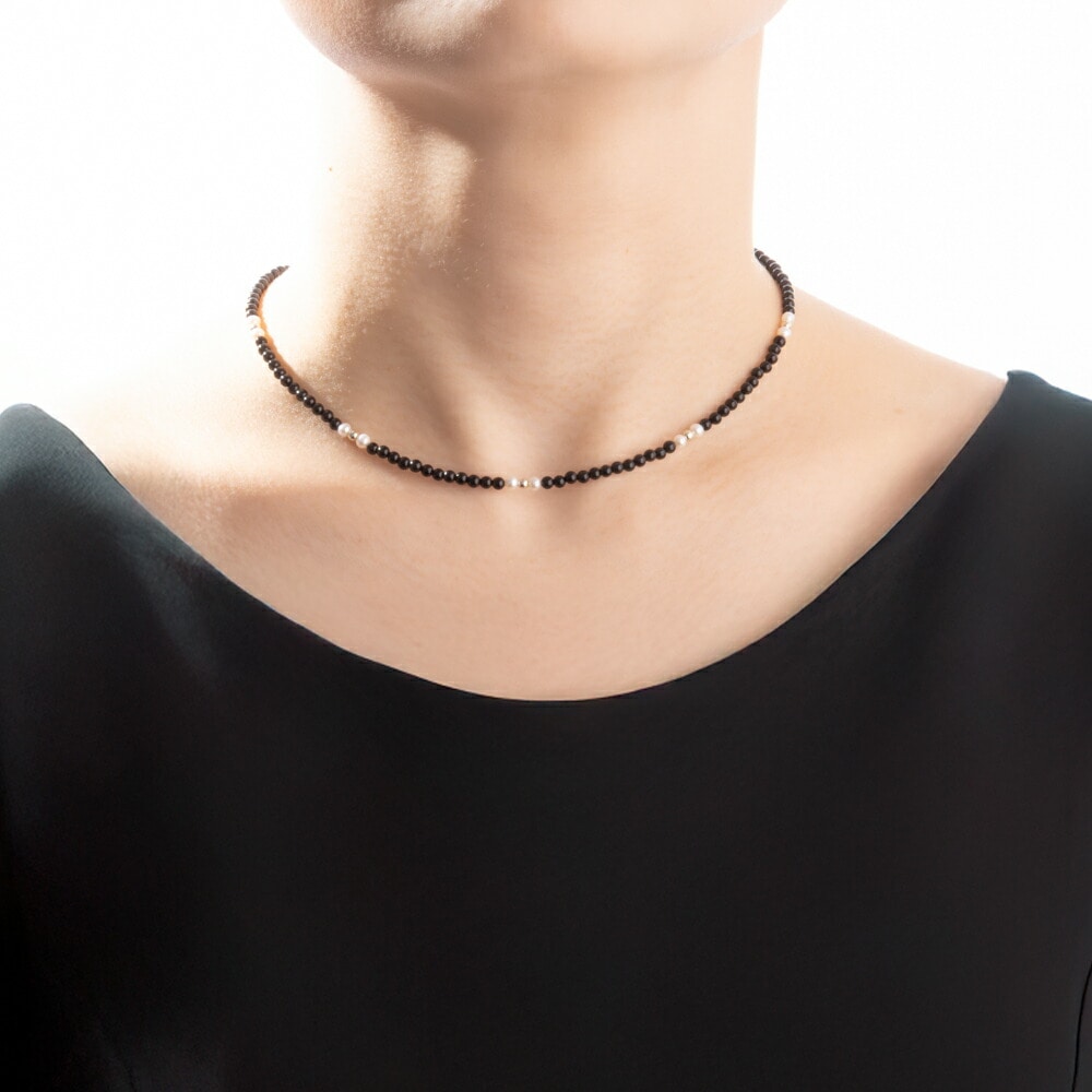 テリが良く、丸い形の淡水パールとSV丸玉がアクセントになったオニキスネックレスです。オニキスは強力な魔除けのエネルギーを持つとされており、悪縁を断ちトラブルから持ち主を守る石として知られています。 また、成功や目標達成のサポートをしてくれる働きも期待できるといわれています。