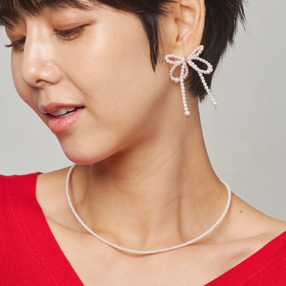 アイテム一つで日々のコーデを華やかにするのは、どのシーンでも活躍し、いつも愛されているリボンアイテムならではです。トレンドのリボンモチーフを、テリが良く丸い形の2サイズの淡水パールでフェミニンに仕上げたピアスです。リボンモチーフは"絆"や"約束"を意味します。