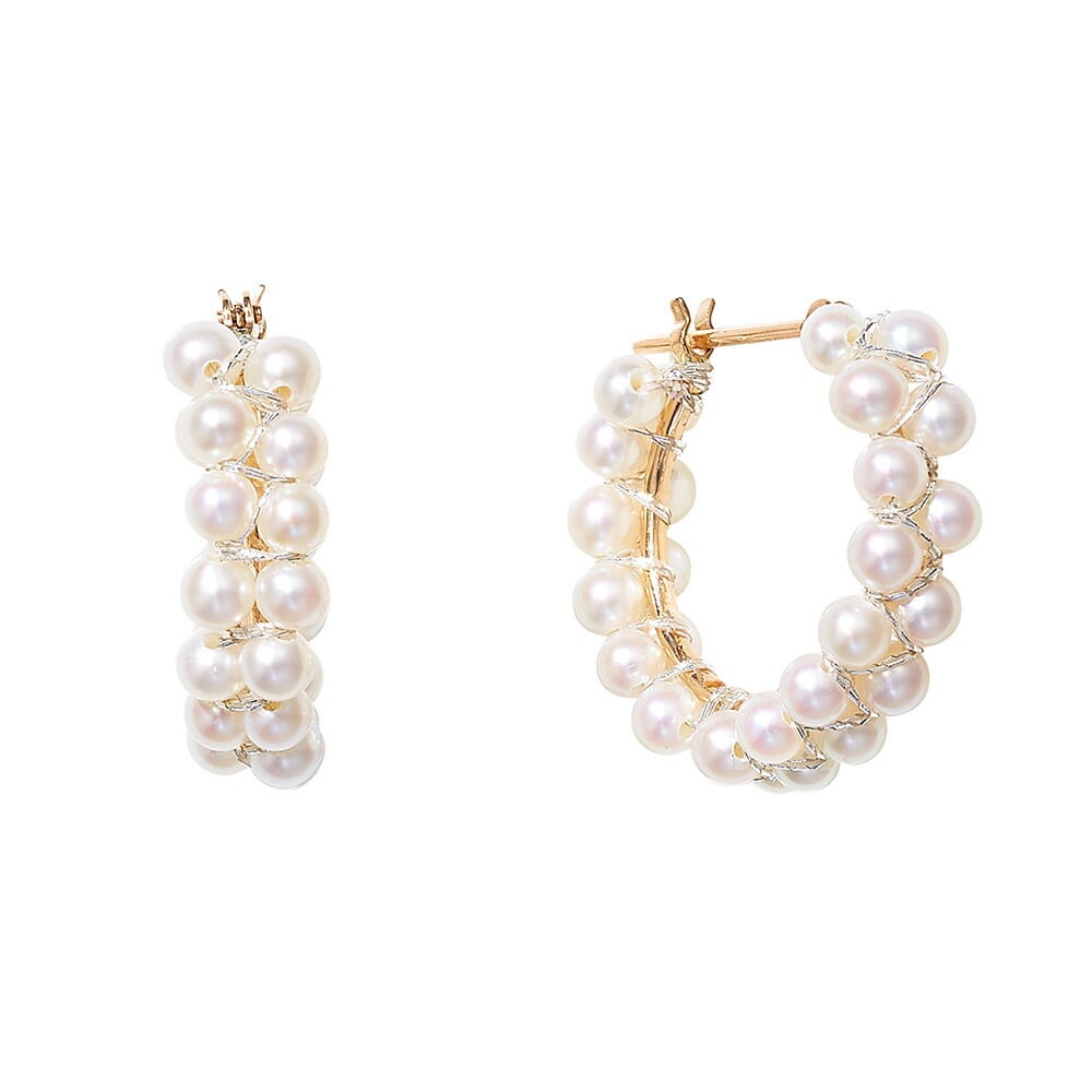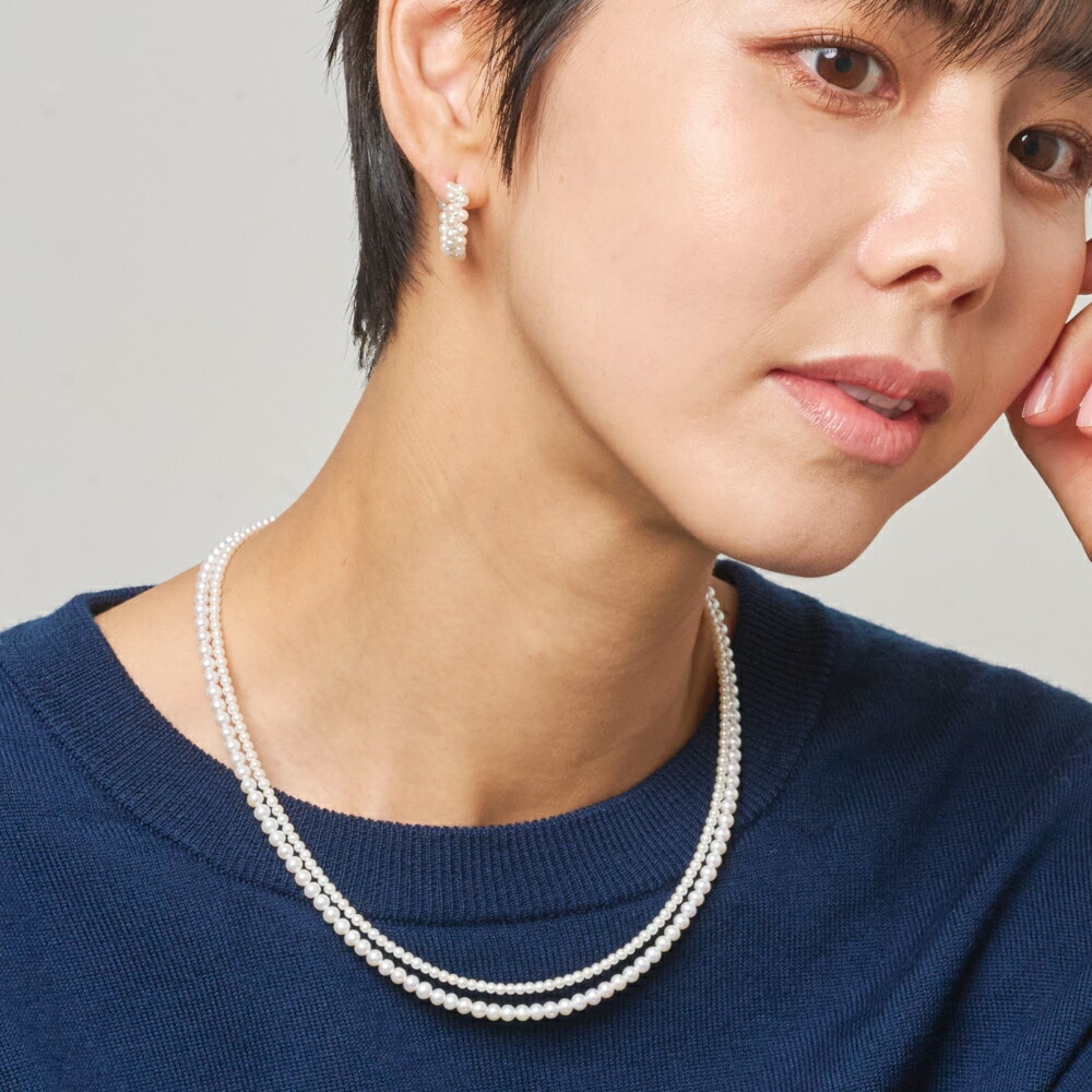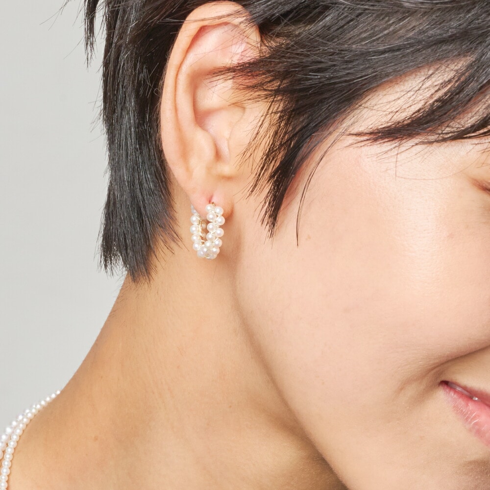 フォーマルな印象が強いパールですが、程良い大きさの地金フープピアスに添ってひとつひとつ手作りで組み上げることで、デイリーにも使いやすく仕上げました。耳元にボリュームのあるピアスを着けることでお顔回りが華やぎます。