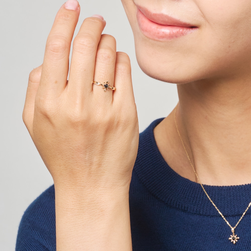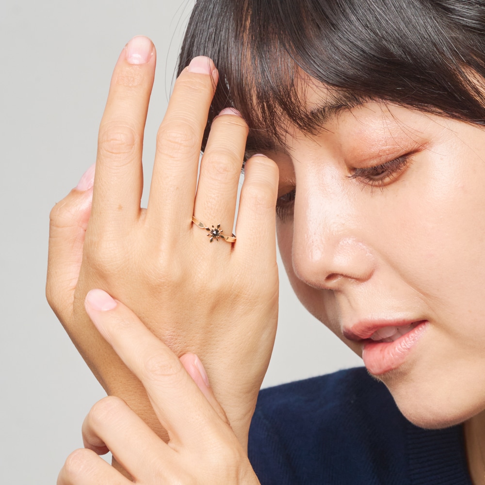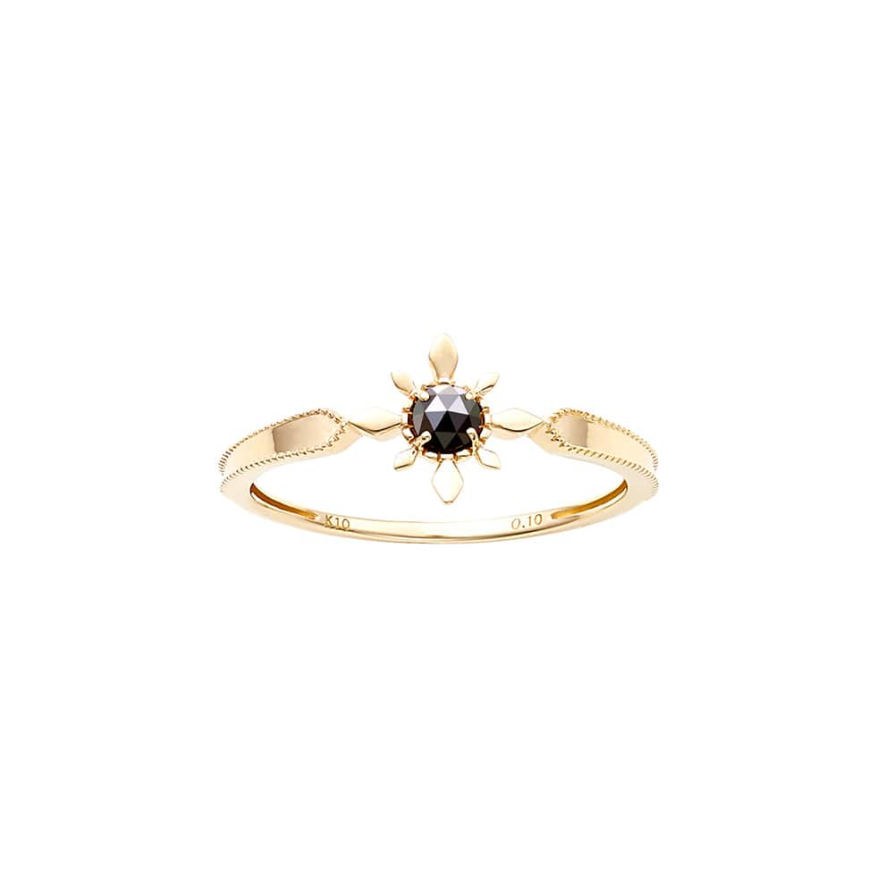 神秘的な輝きのブラックダイヤモンドを使用したリングです。ブラックダイヤモンドには悪運を退け、幸運や成功へと導く力が宿ると言われ、お守りとして身に着けたいジュエリーです。
