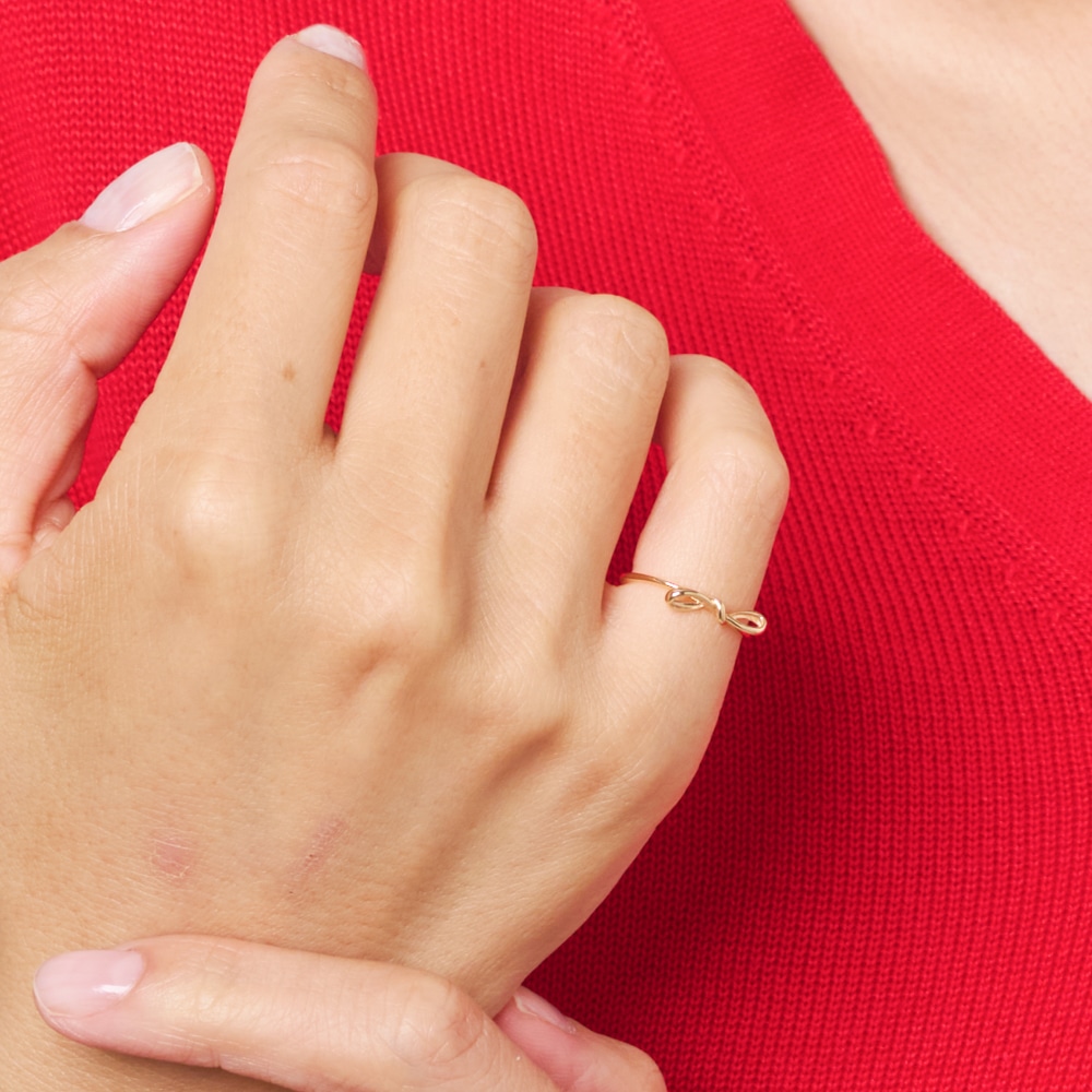 地金の艶が引き立つピンキーリング。甘すぎないリボンモチーフが、手持ちのアイテムと併せてコーディネートしやすいアイテムです。