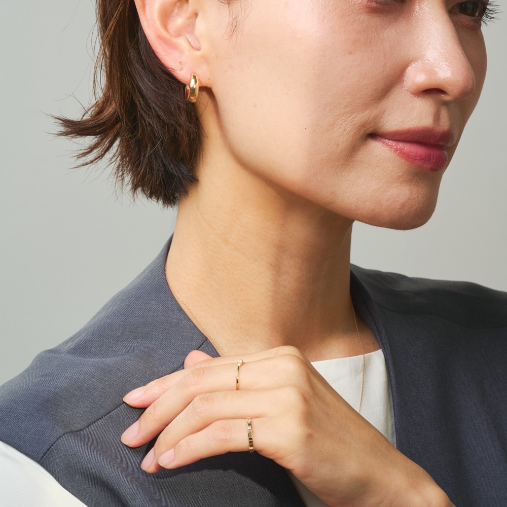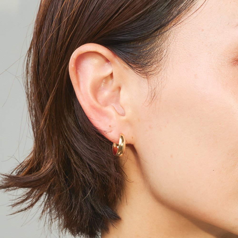 艶めきたっぷりの地金ピアス。ぷっくりとした重厚感あるフォルムがお顔周りにモードな印象をプラス。シンプルながらも程よいサイズ感でカジュアルでもキレイめスタイルにも合わせやすいアイテムです。