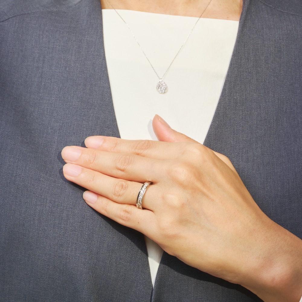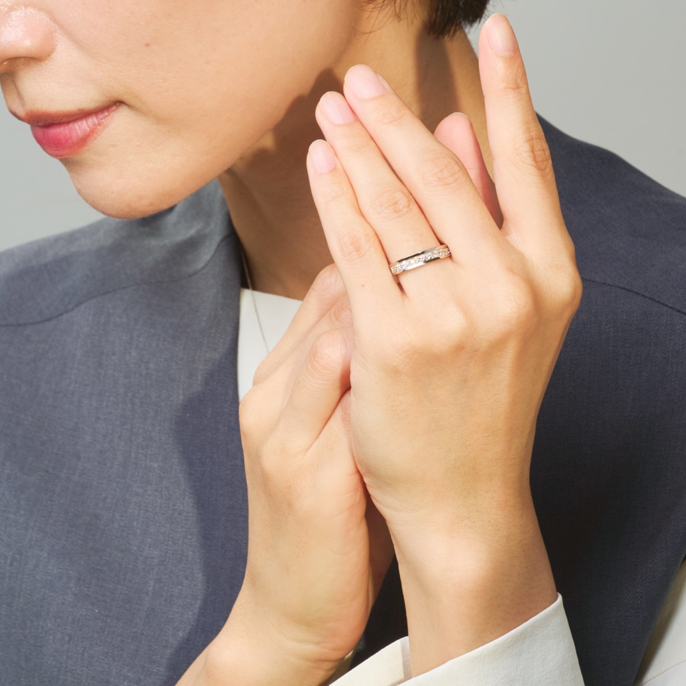 ダイヤモンドの輝きが引き立つシンプルなデザインのリング。お手元を華やかに美しくみせてくれます。 装いを選ばず、幅広いシーンで活躍するアイテムです。