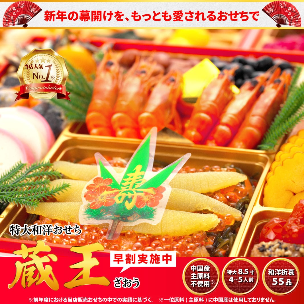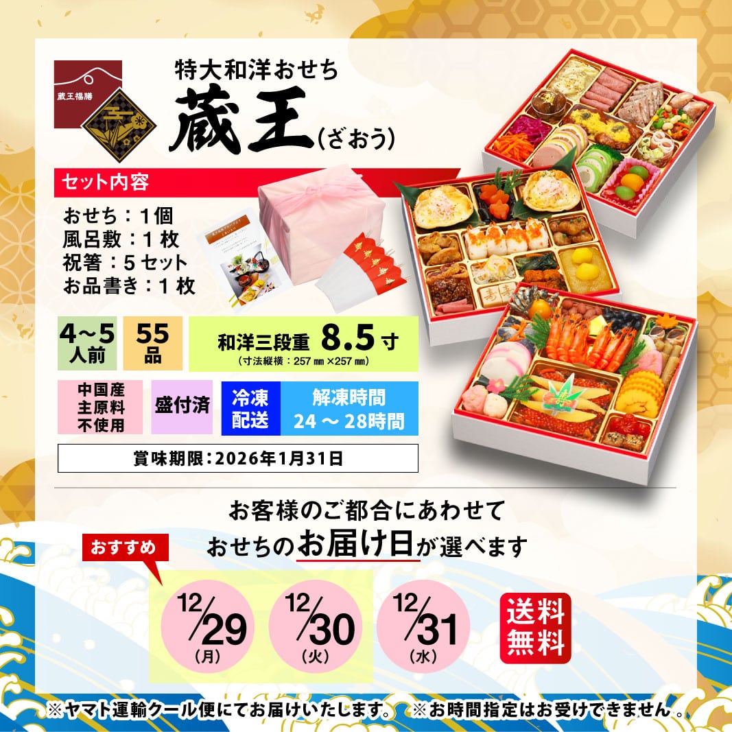 おせち 2026 おせち料理 早割 【蔵王】特大 8.5寸 4人前 5人前 全55品 予約 2026年 4~5人前 お節料理 お節 御節 osechi oseti 大きい 美味しい おいしい 冷凍 冷凍おせち 洋風おせち 和洋おせち 有名 人気 おすすめ 4人用 オードブル 和洋 和洋折衷 蔵王福膳 12月29日お届け