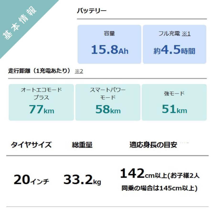 (注1) 適応身長は、1人で乗車時、両足のつま先が地面につく目安となる身長です。幼児2人乗車時の適応身長は、両足のかかとが地面につく目安となる身長です。