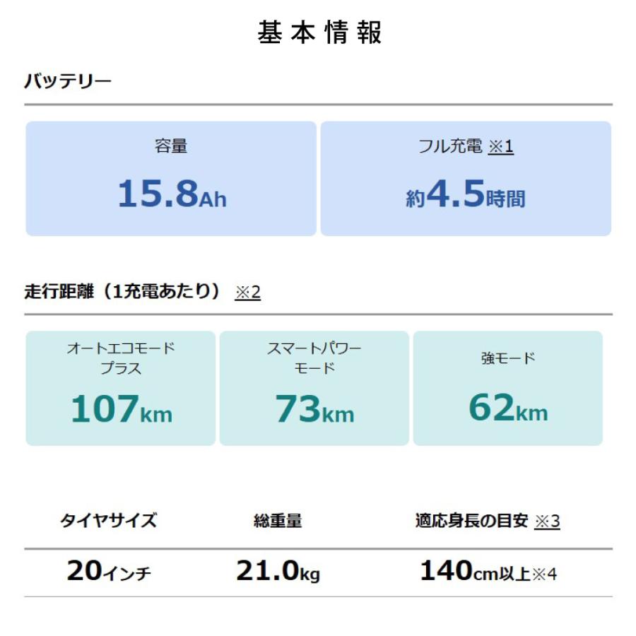 (注1) PASの走行できる距離は走る場所や走り方によって変わります。1充電あたりの走行距離は、車種によって異なるほか、道路状況、走行モード、走り方、気温、車載重量などによって変わります。なお、表記されている走行距離は標準パターンで測定した値であり、1充電あたりの走行距離を保証するものではありません。目安としてご活用ください。 *バッテリー新品、常温15?25℃、車載重量(乗員および荷物を合計した重量)65kg、平滑乾燥路面、無風、無灯火状態、製造業者指定のタイヤ空気圧で、平坦路(1km)、勾配4度の上り坂(1km)を含む全長4kmの標準走行路を設定し、平坦路「変速ギア・3」15km/h、上り坂「変速ギア・2」10km/h、下り坂「変速ギア・3」20km/hで走行し、1kmごとに一旦停止を行ったときのテストデータ。