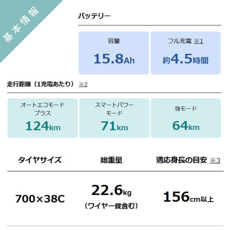 (注1) PASの走行できる距離は走る場所や走り方によって変わります。1充電あたりの走行距離は、車種によって異なるほか、道路状況、走行モード、走り方、気温、車載重量などによって変わります。なお、表記されている走行距離は標準パターンで測定した値であり、1充電あたりの走行距離を保証するものではありません。目安としてご活用ください。 *バッテリー新品、常温15?25℃、車載重量(乗員および荷物を合計した重量)65kg、平滑乾燥路面、無風、無灯火状態、製造業者指定のタイヤ空気圧で、平坦路(1km)、勾配4度の上り坂(1km)を含む全長4kmの標準走行路を設定し、平坦路「変速ギア・3」15km/h、上り坂「変速ギア・2」10km/h、下り坂「変速ギア・3」20km/hで走行し、1kmごとに一旦停止を行ったときのテストデータ。
