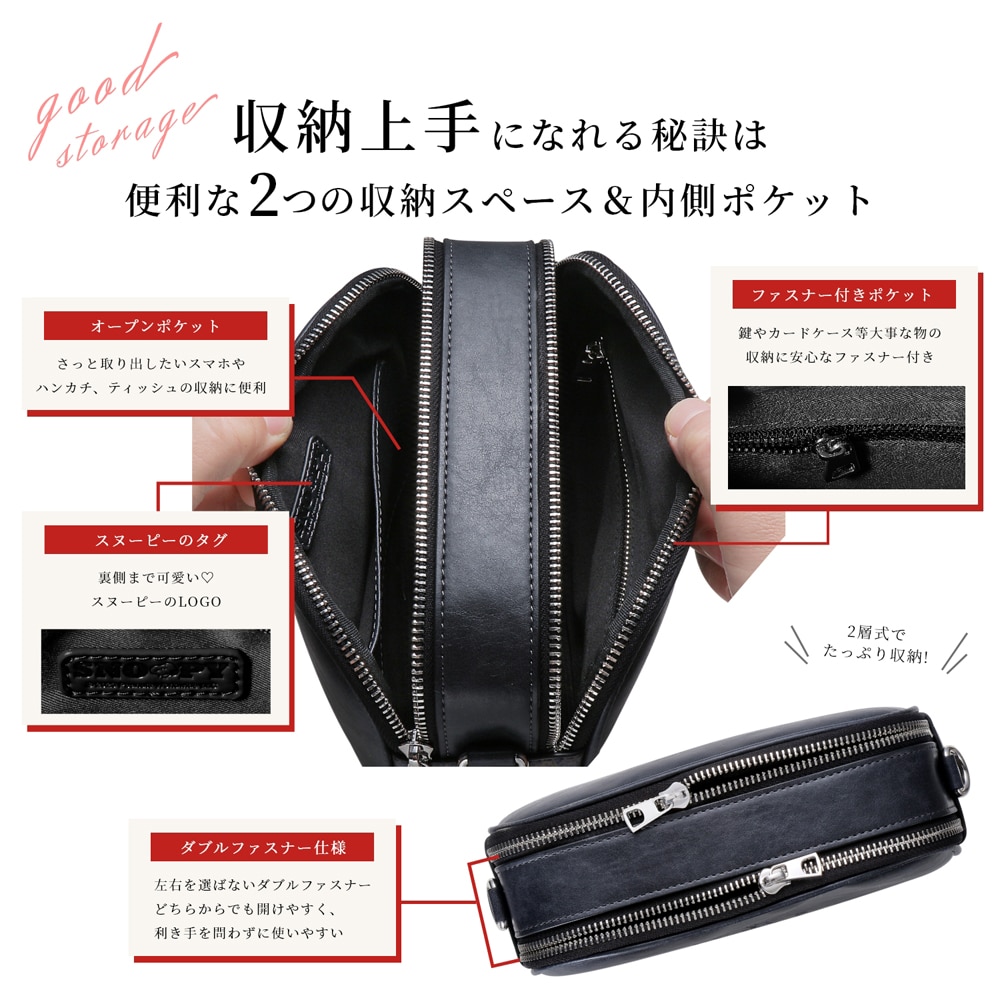 コロンと丸みのあるフォルムが可愛いダブルファスナースヌーピーミニバッグ