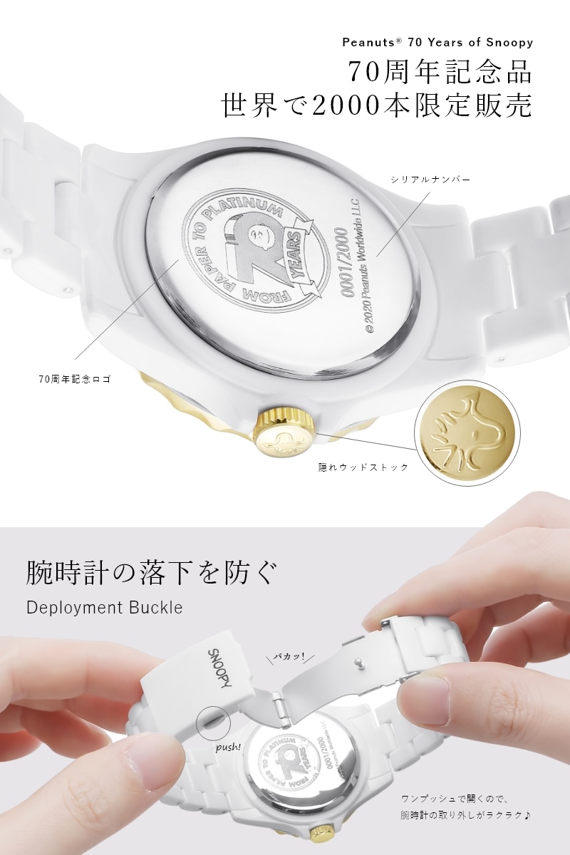 ピーナッツ誕生70周年を記念して特注で作られた本品。ケースとブレスレットの両方に新型プラスチック(ハイブリッドセラミック)を採用。肌にやさしく、低アレルギー性の特別な腕時計です。
