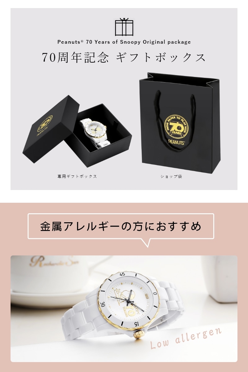 スヌーピー70周年記念企画商品。かわいいスヌーピーキャラクターハイブリッドセラミック腕時計